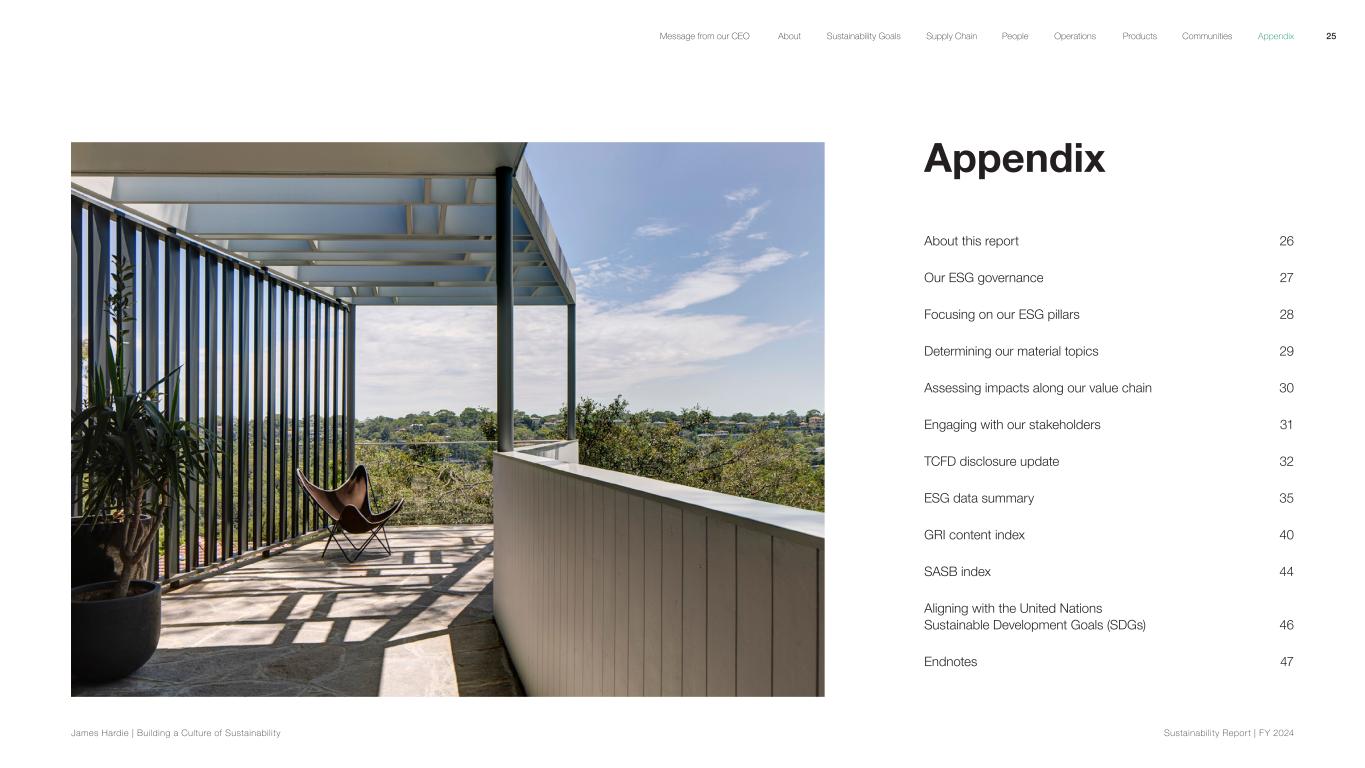 Appendix About this report 26 Our ESG governance 27 Focusing on our ESG pillars 28 Determining our material topics 29 Assessing impacts along our value chain 30 Engaging with our stakeholders 31 TCFD disclosure update 32 ESG data summary 35 GRI content index 40 SASB index 44 Aligning with the United Nations Sustainable Development Goals (SDGs) 46 Endnotes 47 25 James Hardie | Building a Culture of Sustainability Sustainability Repor t | FY 2024 About Sustainability Goals Supply Chain OperationsMessage from our CEO People Products Communities Appendix