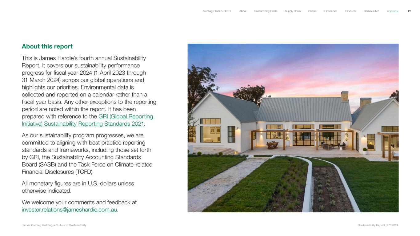 About this report This is James Hardie’s fourth annual Sustainability Report. It covers our sustainability performance progress for fiscal year 2024 (1 April 2023 through 31 March 2024) across our global operations and highlights our priorities. Environmental data is collected and reported on a calendar rather than a fiscal year basis. Any other exceptions to the reporting period are noted within the report. It has been prepared with reference to the GRI (Global Reporting Initiative) Sustainability Reporting Standards 2021. As our sustainability program progresses, we are committed to aligning with best practice reporting standards and frameworks, including those set forth by GRI, the Sustainability Accounting Standards Board (SASB) and the Task Force on Climate-related Financial Disclosures (TCFD). All monetary figures are in U.S. dollars unless otherwise indicated. We welcome your comments and feedback at [email protected]. 26 James Hardie | Building a Culture of Sustainability Sustainability Repor t | FY 2024 About Sustainability Goals Supply Chain OperationsMessage from our CEO People Products Communities Appendix