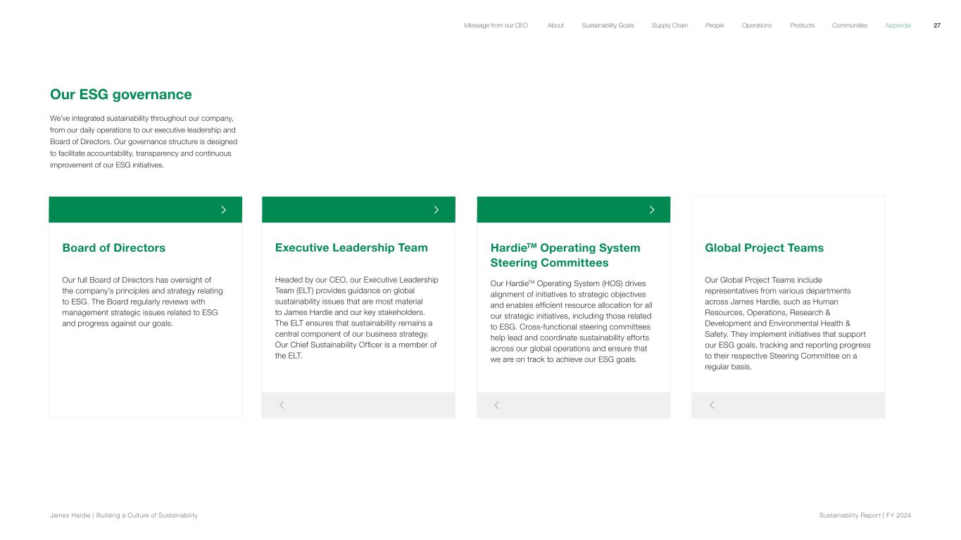 Our ESG governance We’ve integrated sustainability throughout our company, from our daily operations to our executive leadership and Board of Directors. Our governance structure is designed to facilitate accountability, transparency and continuous improvement of our ESG initiatives. Board of Directors Our full Board of Directors has oversight of the company’s principles and strategy relating to ESG. The Board regularly reviews with management strategic issues related to ESG and progress against our goals. Executive Leadership Team Headed by our CEO, our Executive Leadership Team (ELT) provides guidance on global sustainability issues that are most material to James Hardie and our key stakeholders. The ELT ensures that sustainability remains a central component of our business strategy. Our Chief Sustainability Officer is a member of the ELT. HardieTM Operating System Steering Committees Our HardieTM Operating System (HOS) drives alignment of initiatives to strategic objectives and enables efficient resource allocation for all our strategic initiatives, including those related to ESG. Cross-functional steering committees help lead and coordinate sustainability efforts across our global operations and ensure that we are on track to achieve our ESG goals. Global Project Teams Our Global Project Teams include representatives from various departments across James Hardie, such as Human Resources, Operations, Research & Development and Environmental Health & Safety. They implement initiatives that support our ESG goals, tracking and reporting progress to their respective Steering Committee on a regular basis. 27 James Hardie | Building a Culture of Sustainability Sustainability Repor t | FY 2024 About Sustainability Goals Supply Chain OperationsMessage from our CEO People Products Communities Appendix