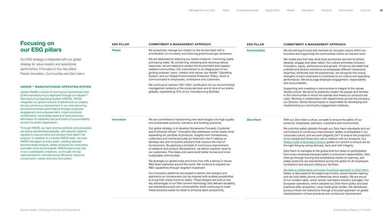 Focusing on our ESG pillars Our ESG strategy is integrated with our global strategy for value creation and operational performance. It focuses on four key pillars: Planet, Innovation, Communities and Zero Harm. ESG PILLAR COMMITMENT & MANAGEMENT APPROACH Planet We proactively manage our impact on the environment with a prioritization on circularity and reducing greenhouse gas emissions. We are dedicated to reducing our carbon footprint, minimizing waste and saving water. By conserving, renewing and recycling natural resources, we are helping to protect the environment and support resilient communities. Our commitment is an integral part of our guiding purpose, vision, mission and values; our Hardie™ Operating System; and our Global Environmental Protection Policy, which is communicated to employees, contractors and customers. We continue to maintain ISO 14001 certification for our environmental management systems at the corporate level and at nine of our plants globally, representing 47% of our manufacturing facilities. Innovation We are committed to transforming new technologies into high-quality and sustainable products, solutions and building practices. Our global strategy is to develop Homeowner Focused, Customer and Contractor Driven™ innovation that addresses unmet needs while expanding our portfolio of products. Insights from homeowners, customers and contractors play an important role in helping us develop new and innovative solutions that improve the lives of homeowners. By applying a mindset of continuous improvement to research and product development, we deliver superior value to our customers. This helps end users build better homes and more sustainable communities. We leverage our global scale and know-how with a strong in-house R&D team stationed around the world. We continue to expand our R&D capabilities through targeted investment. Our innovation platforms are poised to deliver new designs and aesthetics so homeowners can be inspired with endless possibilities to bring their dream home to reality. These designs are built on the key advantages of our fiber cement technology that delivers durability, low maintenance and non-combustibility while continuing to make these solutions easier to install to enhance labor productivity. ESG PILLAR COMMITMENT & MANAGEMENT APPROACH Communities We are striving to build and maintain an inclusive culture within our business and supporting the communities where we live and work. We create jobs that help drive local economies and aim to attract, develop, engage and retain talent. Our culture promotes inclusion, innovation, equity, performance and growth. Driven by the belief that a skilled and diverse workforce encompasses different viewpoints, expertise, attributes and life experiences, we recognize the unique strengths of each employee to contribute to our culture and operating performance. We encourage employee engagement, responsibility and accountability. Supporting and investing in communities is integral to the James Hardie culture. We strive to positively impact the people and families in the communities in which we operate and where our products are used. Working in collaboration with departments across the company, our Director, Global Social Impact is responsible for developing and implementing our community engagement initiatives. Zero Harm With our Zero Harm culture, we seek to ensure the safety of our products, employees, partners, customers and communities. We prioritize safety globally through our Zero Harm standards and our commitment to continuous improvement. Safety is embedded in our corporate culture, and we work diligently 24/7 to ensure the protection of our people and those who use or interact with our products. Our Global Code of Business Conduct guides our actions to ensure we do the right thing by acting ethically, fairly and with integrity. Zero Harm is managed at the global level but relies on participation from every employee because safety is everyone’s responsibility. New hires go through training that emphasizes hands-on learning, and safety protocols are standardized across the globe for all employees, contractors and anyone visiting our facilities. We take a collaborative and cross-functional approach to Zero Harm. Safety is discussed at the beginning of every James Hardie meeting, and we hold safety phone conferences twice weekly. We are proud of our incident rates, which remain well below industry averages. Our European operations, which adopted our Zero Harm policy and best practices after acquisition, have made great strides. We relentlessly pursue critical risk reductions through a focused approach on global standardization of best practices and continuous improvement. HARDIE™ MANUFACTURING OPERATING SYSTEM James Hardie’s culture of continuous improvement and LEAN manufacturing is deployed through our Hardie™ Manufacturing Operating System (HMOS). HMOS integrates our global network of plants and our people, driving continuous improvement in our manufacturing and environmental performance through employee engagement and empowerment, cross-functional collaboration, knowledge sharing of best practices, elimination of variability and promotion of accountability across the entire organization. Through HMOS, our best practice policies and processes are being standardized globally, with specific regional regulatory requirements and product lines taken into account. In addition to a central HMOS team, we have HMOS managers at every plant, yielding reduced environmental impacts, better products for consumers and safer work environments. HMOS plays a key role in our sustainability initiatives, continually driving improvements in manufacturing efficiency, resource conservation, waste reduction and safety. 28 James Hardie | Building a Culture of Sustainability Sustainability Repor t | FY 2024 About Sustainability Goals Supply Chain OperationsMessage from our CEO People Products Communities Appendix