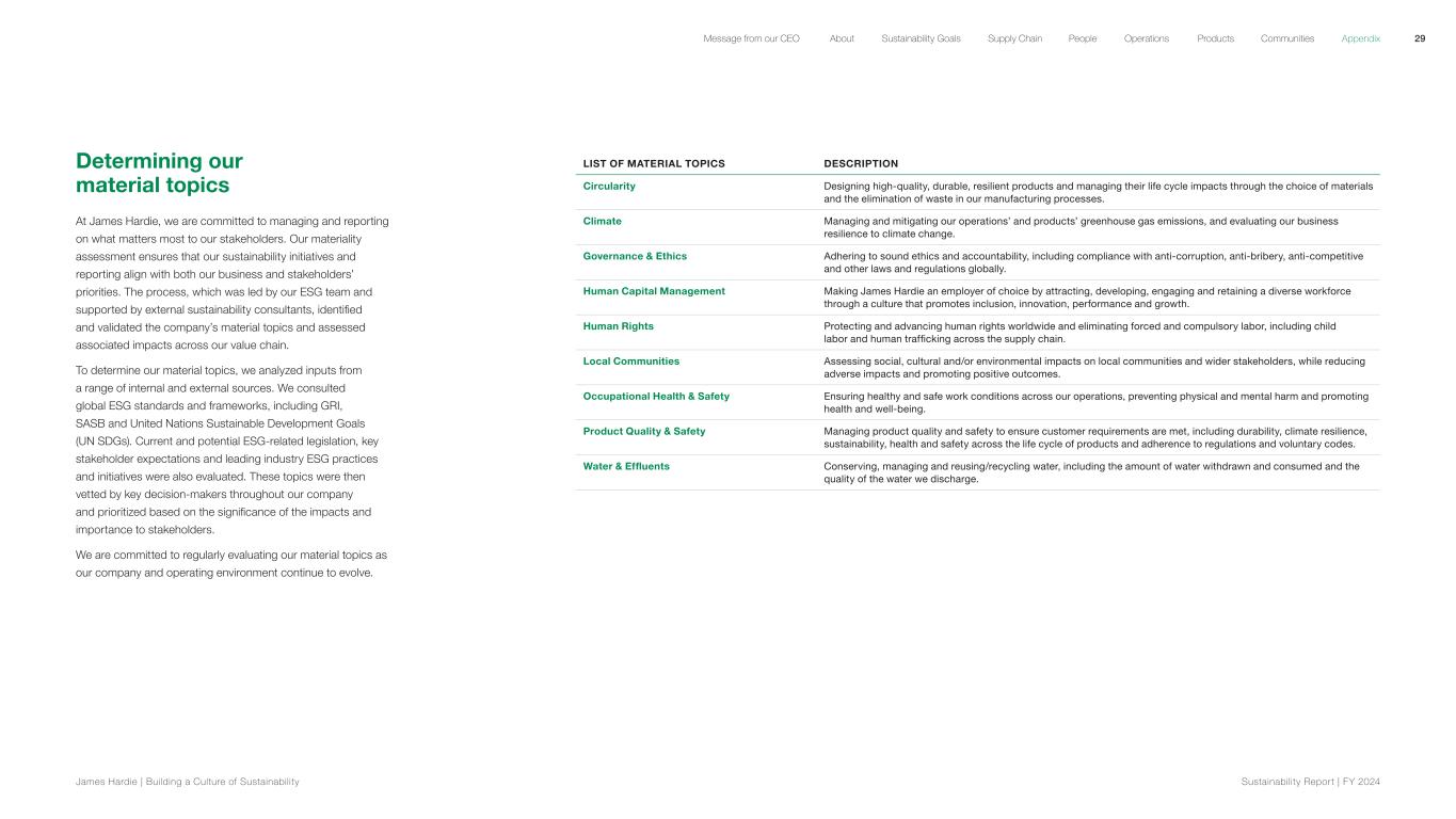 Determining our material topics At James Hardie, we are committed to managing and reporting on what matters most to our stakeholders. Our materiality assessment ensures that our sustainability initiatives and reporting align with both our business and stakeholders’ priorities. The process, which was led by our ESG team and supported by external sustainability consultants, identified and validated the company’s material topics and assessed associated impacts across our value chain. To determine our material topics, we analyzed inputs from a range of internal and external sources. We consulted global ESG standards and frameworks, including GRI, SASB and United Nations Sustainable Development Goals (UN SDGs). Current and potential ESG-related legislation, key stakeholder expectations and leading industry ESG practices and initiatives were also evaluated. These topics were then vetted by key decision-makers throughout our company and prioritized based on the significance of the impacts and importance to stakeholders. We are committed to regularly evaluating our material topics as our company and operating environment continue to evolve. LIST OF MATERIAL TOPICS DESCRIPTION Circularity Designing high-quality, durable, resilient products and managing their life cycle impacts through the choice of materials and the elimination of waste in our manufacturing processes. Climate Managing and mitigating our operations’ and products’ greenhouse gas emissions, and evaluating our business resilience to climate change. Governance & Ethics Adhering to sound ethics and accountability, including compliance with anti-corruption, anti-bribery, anti-competitive and other laws and regulations globally. Human Capital Management Making James Hardie an employer of choice by attracting, developing, engaging and retaining a diverse workforce through a culture that promotes inclusion, innovation, performance and growth. Human Rights Protecting and advancing human rights worldwide and eliminating forced and compulsory labor, including child labor and human trafficking across the supply chain. Local Communities Assessing social, cultural and/or environmental impacts on local communities and wider stakeholders, while reducing adverse impacts and promoting positive outcomes. Occupational Health & Safety Ensuring healthy and safe work conditions across our operations, preventing physical and mental harm and promoting health and well-being. Product Quality & Safety Managing product quality and safety to ensure customer requirements are met, including durability, climate resilience, sustainability, health and safety across the life cycle of products and adherence to regulations and voluntary codes. Water & Effluents Conserving, managing and reusing/recycling water, including the amount of water withdrawn and consumed and the quality of the water we discharge. 29 James Hardie | Building a Culture of Sustainability Sustainability Repor t | FY 2024 About Sustainability Goals Supply Chain OperationsMessage from our CEO People Products Communities Appendix