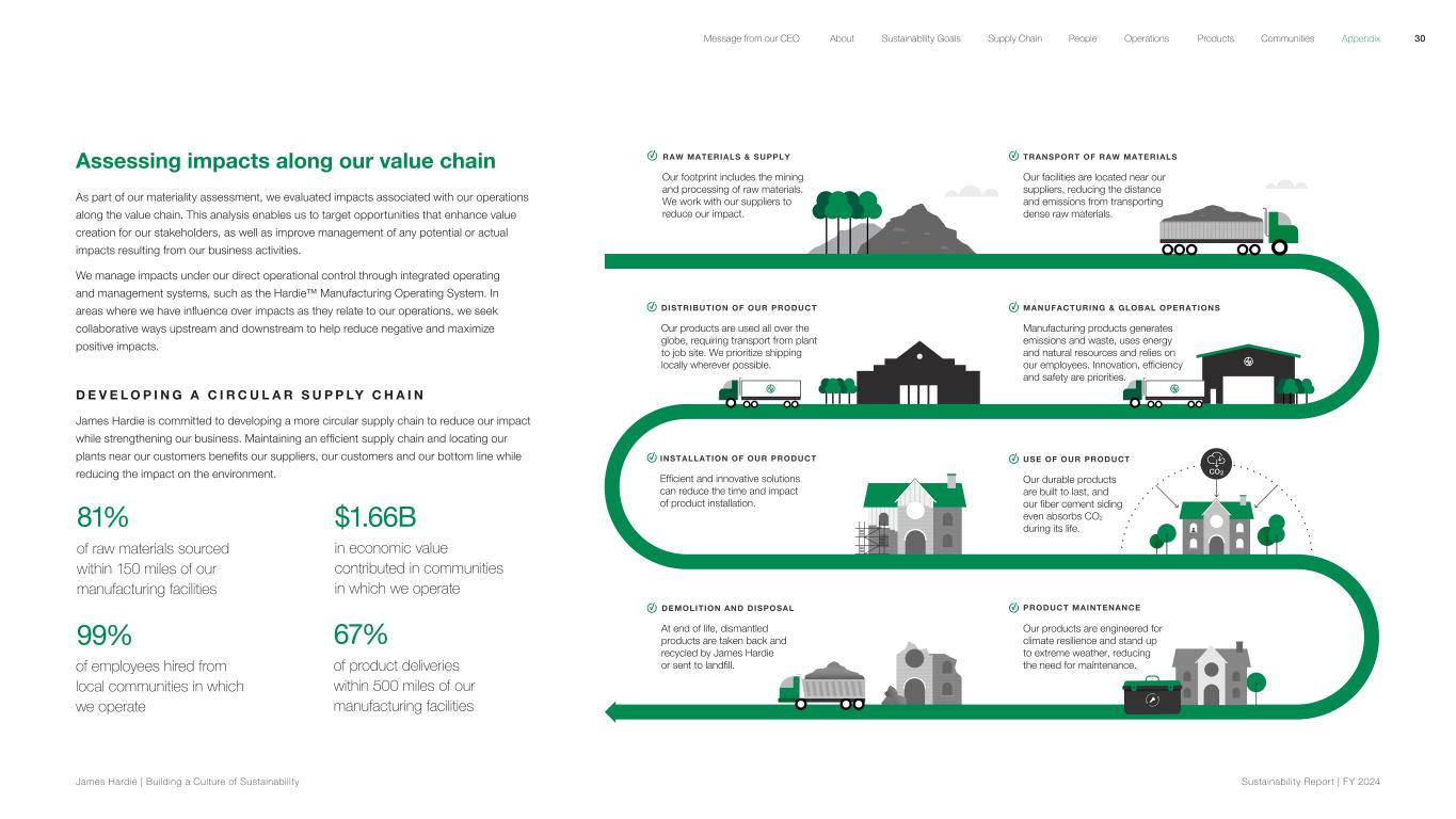 Assessing impacts along our value chain As part of our materiality assessment, we evaluated impacts associated with our operations along the value chain. This analysis enables us to target opportunities that enhance value creation for our stakeholders, as well as improve management of any potential or actual impacts resulting from our business activities. We manage impacts under our direct operational control through integrated operating and management systems, such as the Hardie™ Manufacturing Operating System. In areas where we have influence over impacts as they relate to our operations, we seek collaborative ways upstream and downstream to help reduce negative and maximize positive impacts. D E V E L O P I N G A C I R C U L A R S U P P LY C H A I N James Hardie is committed to developing a more circular supply chain to reduce our impact while strengthening our business. Maintaining an efficient supply chain and locating our plants near our customers benefits our suppliers, our customers and our bottom line while reducing the impact on the environment. RAW MATERIALS & SUPPLY Our footprint includes the mining and processing of raw materials. We work with our suppliers to reduce our impact. TRANSPORT OF RAW MATERIALS Our facilities are located near our suppliers, reducing the distance and emissions from transporting dense raw materials. MANUFACTURING & GLOBAL OPERATIONS Manufacturing products generates emissions and waste, uses energy and natural resources and relies on our employees. Innovation, efficiency and safety are priorities. DISTRIBUTION OF OUR PRODUCT Our products are used all over the globe, requiring transport from plant to job site. We prioritize shipping locally wherever possible. INSTALLATION OF OUR PRODUCT Efficient and innovative solutions can reduce the time and impact of product installation. CO2 Our products are engineered for climate resilience and stand up to extreme weather, reducing the need for maintenance. USE OF OUR PRODUCT Our durable products are built to last, and our fiber cement siding even absorbs CO2 during its life. PRODUCT MAINTENANCEDEMOLITION AND DISPOSAL At end of life, dismantled products are taken back and recycled by James Hardie or sent to landfill. 81% of raw materials sourced within 150 miles of our manufacturing facilities $1.66B in economic value contributed in communities in which we operate 99% of employees hired from local communities in which we operate 67% of product deliveries within 500 miles of our manufacturing facilities 30 James Hardie | Building a Culture of Sustainability Sustainability Repor t | FY 2024 About Sustainability Goals Supply Chain OperationsMessage from our CEO People Products Communities Appendix