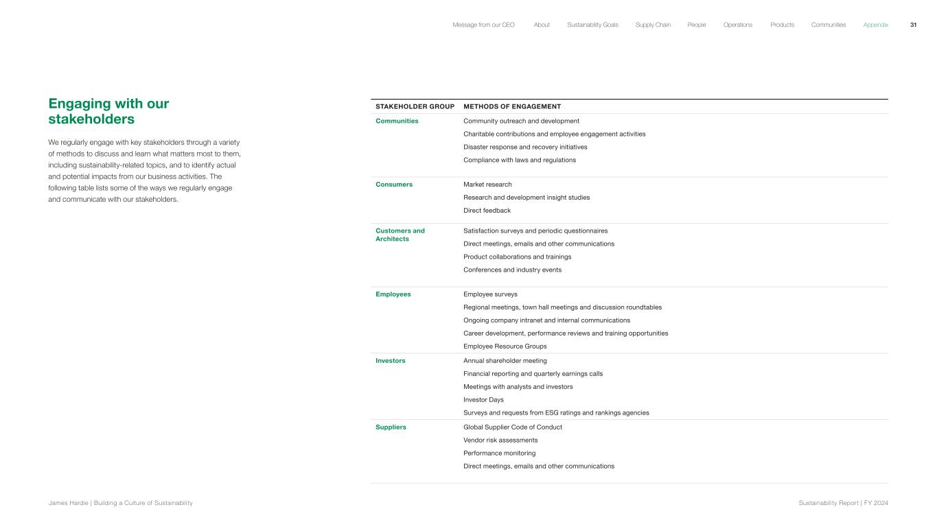 Engaging with our stakeholders We regularly engage with key stakeholders through a variety of methods to discuss and learn what matters most to them, including sustainability-related topics, and to identify actual and potential impacts from our business activities. The following table lists some of the ways we regularly engage and communicate with our stakeholders. STAKEHOLDER GROUP METHODS OF ENGAGEMENT Communities Community outreach and development Charitable contributions and employee engagement activities Disaster response and recovery initiatives Compliance with laws and regulations Consumers Market research Research and development insight studies Direct feedback Customers and Architects Satisfaction surveys and periodic questionnaires Direct meetings, emails and other communications Product collaborations and trainings Conferences and industry events Employees Employee surveys Regional meetings, town hall meetings and discussion roundtables Ongoing company intranet and internal communications Career development, performance reviews and training opportunities Employee Resource Groups Investors Annual shareholder meeting Financial reporting and quarterly earnings calls Meetings with analysts and investors Investor Days Surveys and requests from ESG ratings and rankings agencies Suppliers Global Supplier Code of Conduct Vendor risk assessments Performance monitoring Direct meetings, emails and other communications 31 James Hardie | Building a Culture of Sustainability Sustainability Repor t | FY 2024 About Sustainability Goals Supply Chain OperationsMessage from our CEO People Products Communities Appendix