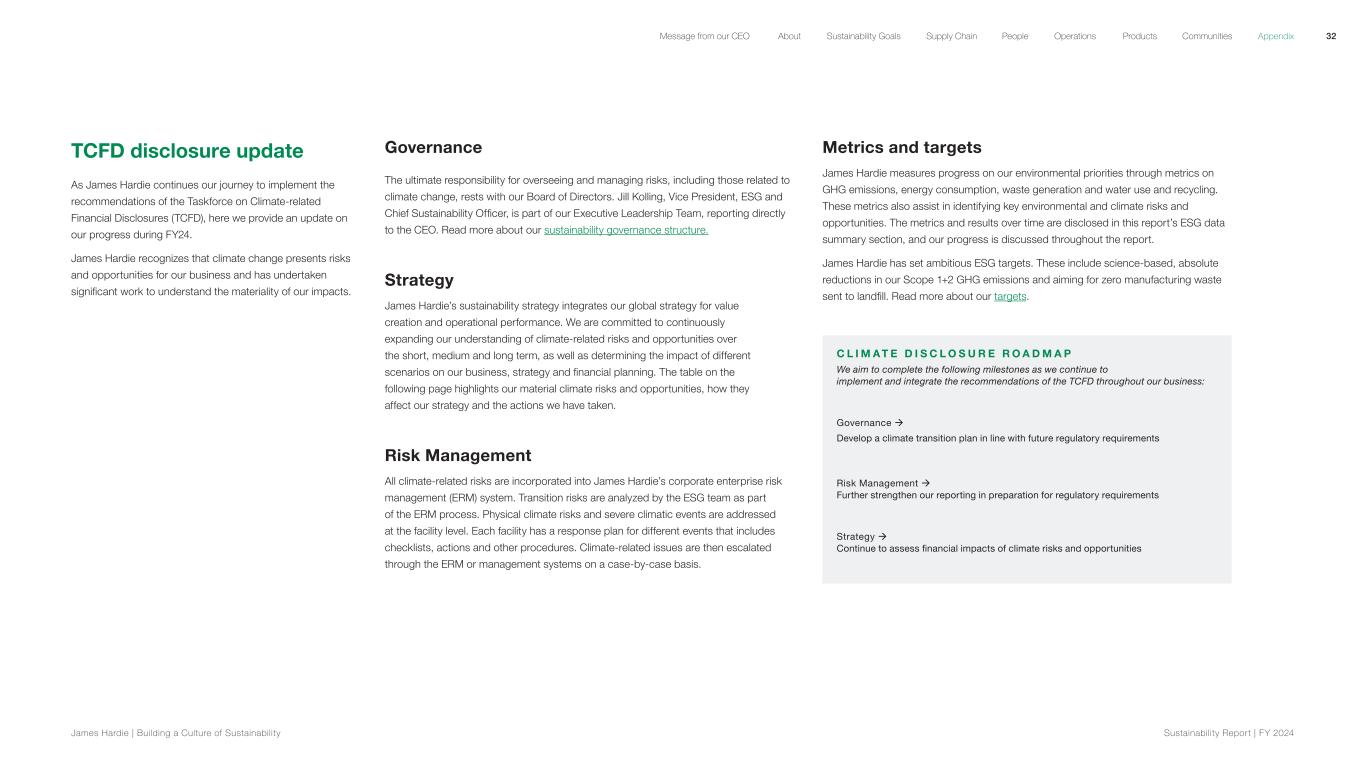 TCFD disclosure update As James Hardie continues our journey to implement the recommendations of the Taskforce on Climate-related Financial Disclosures (TCFD), here we provide an update on our progress during FY24. James Hardie recognizes that climate change presents risks and opportunities for our business and has undertaken significant work to understand the materiality of our impacts. Governance The ultimate responsibility for overseeing and managing risks, including those related to climate change, rests with our Board of Directors. Jill Kolling, Vice President, ESG and Chief Sustainability Officer, is part of our Executive Leadership Team, reporting directly to the CEO. Read more about our sustainability governance structure. Strategy James Hardie’s sustainability strategy integrates our global strategy for value creation and operational performance. We are committed to continuously expanding our understanding of climate-related risks and opportunities over the short, medium and long term, as well as determining the impact of different scenarios on our business, strategy and financial planning. The table on the following page highlights our material climate risks and opportunities, how they affect our strategy and the actions we have taken. Risk Management All climate-related risks are incorporated into James Hardie’s corporate enterprise risk management (ERM) system. Transition risks are analyzed by the ESG team as part of the ERM process. Physical climate risks and severe climatic events are addressed at the facility level. Each facility has a response plan for different events that includes checklists, actions and other procedures. Climate-related issues are then escalated through the ERM or management systems on a case-by-case basis. Metrics and targets James Hardie measures progress on our environmental priorities through metrics on GHG emissions, energy consumption, waste generation and water use and recycling. These metrics also assist in identifying key environmental and climate risks and opportunities. The metrics and results over time are disclosed in this report’s ESG data summary section, and our progress is discussed throughout the report. James Hardie has set ambitious ESG targets. These include science-based, absolute reductions in our Scope 1+2 GHG emissions and aiming for zero manufacturing waste sent to landfill. Read more about our targets. C L I M A T E D I S C L O S U R E R O A D M A P We aim to complete the following milestones as we continue to implement and integrate the recommendations of the TCFD throughout our business: Governance Develop a climate transition plan in line with future regulatory requirements Risk Management Further strengthen our reporting in preparation for regulatory requirements Strategy Continue to assess financial impacts of climate risks and opportunities 32 James Hardie | Building a Culture of Sustainability Sustainability Repor t | FY 2024 About Sustainability Goals Supply Chain OperationsMessage from our CEO People Products Communities Appendix