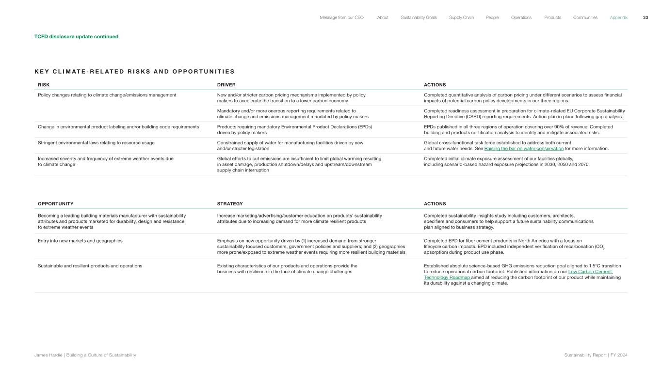 K E Y C L I M AT E - R E L AT E D R I S K S A N D O P P O R T U N I T I E S RISK DRIVER ACTIONS Policy changes relating to climate change/emissions management New and/or stricter carbon pricing mechanisms implemented by policy makers to accelerate the transition to a lower carbon economy Completed quantitative analysis of carbon pricing under different scenarios to assess financial impacts of potential carbon policy developments in our three regions. Mandatory and/or more onerous reporting requirements related to climate change and emissions management mandated by policy makers Completed readiness assessment in preparation for climate-related EU Corporate Sustainability Reporting Directive (CSRD) reporting requirements. Action plan in place following gap analysis. Change in environmental product labeling and/or building code requirements Products requiring mandatory Environmental Product Declarations (EPDs) driven by policy makers EPDs published in all three regions of operation covering over 90% of revenue. Completed building and products certification analysis to identify and mitigate associated risks. Stringent environmental laws relating to resource usage Constrained supply of water for manufacturing facilities driven by new and/or stricter legislation Global cross-functional task force established to address both current and future water needs. See Raising the bar on water conservation for more information. Increased severity and frequency of extreme weather events due to climate change Global efforts to cut emissions are insufficient to limit global warming resulting in asset damage, production shutdown/delays and upstream/downstream supply chain interruption Completed initial climate exposure assessment of our facilities globally, including scenario-based hazard exposure projections in 2030, 2050 and 2070. OPPORTUNITY STRATEGY ACTIONS Becoming a leading building materials manufacturer with sustainability attributes and products marketed for durability, design and resistance to extreme weather events Increase marketing/advertising/customer education on products’ sustainability attributes due to increasing demand for more climate resilient products Completed sustainability insights study including customers, architects, specifiers and consumers to help support a future sustainability communications plan aligned to business strategy. Entry into new markets and geographies Emphasis on new opportunity driven by (1) increased demand from stronger sustainability focused customers, government policies and suppliers; and (2) geographies more prone/exposed to extreme weather events requiring more resilient building materials Completed EPD for fiber cement products in North America with a focus on lifecycle carbon impacts. EPD included independent verification of recarbonation (CO2 absorption) during product use phase. Sustainable and resilient products and operations Existing characteristics of our products and operations provide the business with resilience in the face of climate change challenges Established absolute science-based GHG emissions reduction goal aligned to 1.5°C transition to reduce operational carbon footprint. Published information on our Low Carbon Cement Technology Roadmap aimed at reducing the carbon footprint of our product while maintaining its durability against a changing climate. TCFD disclosure update continued 33 James Hardie | Building a Culture of Sustainability Sustainability Repor t | FY 2024 About Sustainability Goals Supply Chain OperationsMessage from our CEO People Products Communities Appendix