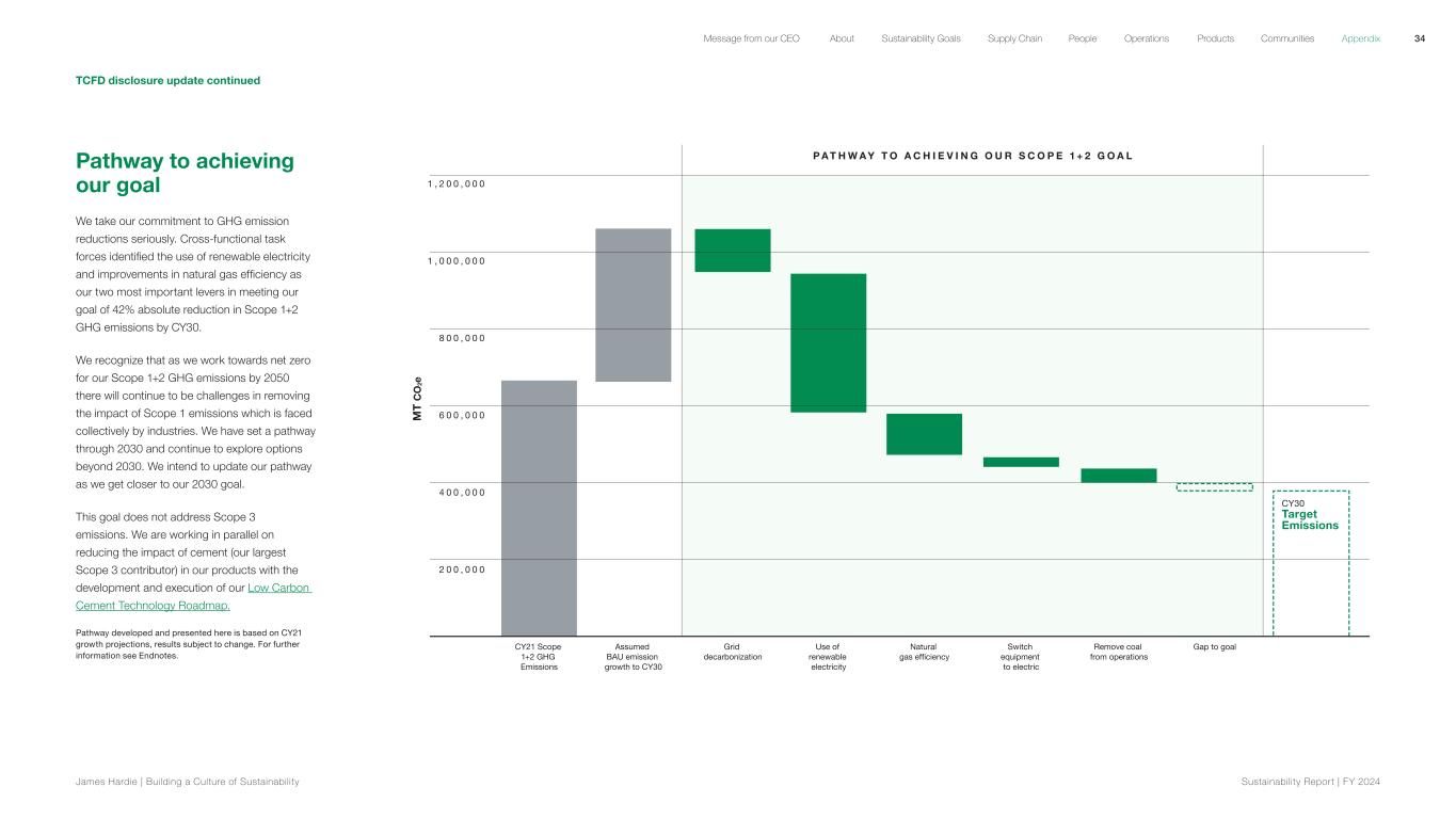 2 0 0 , 0 0 0 4 0 0 , 0 0 0 6 0 0 , 0 0 0 8 0 0 , 0 0 0 1 , 0 0 0 , 0 0 0 1 , 2 0 0 , 0 0 0 CY21 Scope 1+2 GHG Emissions Assumed BAU emission growth to CY30 Grid decarbonization Use of renewable electricity Natural gas efficiency Switch equipment to electric Remove coal from operations Gap to goal CY30 Target Emissions M T C O 2e P A T H W A Y T O A C H I E V I N G O U R S C O P E 1 + 2 G O A LPathway to achieving our goal We take our commitment to GHG emission reductions seriously. Cross-functional task forces identified the use of renewable electricity and improvements in natural gas efficiency as our two most important levers in meeting our goal of 42% absolute reduction in Scope 1+2 GHG emissions by CY30. We recognize that as we work towards net zero for our Scope 1+2 GHG emissions by 2050 there will continue to be challenges in removing the impact of Scope 1 emissions which is faced collectively by industries. We have set a pathway through 2030 and continue to explore options beyond 2030. We intend to update our pathway as we get closer to our 2030 goal. This goal does not address Scope 3 emissions. We are working in parallel on reducing the impact of cement (our largest Scope 3 contributor) in our products with the development and execution of our Low Carbon Cement Technology Roadmap. Pathway developed and presented here is based on CY21 growth projections, results subject to change. For further information see Endnotes. TCFD disclosure update continued 34 James Hardie | Building a Culture of Sustainability Sustainability Repor t | FY 2024 About Sustainability Goals Supply Chain OperationsMessage from our CEO People Products Communities Appendix