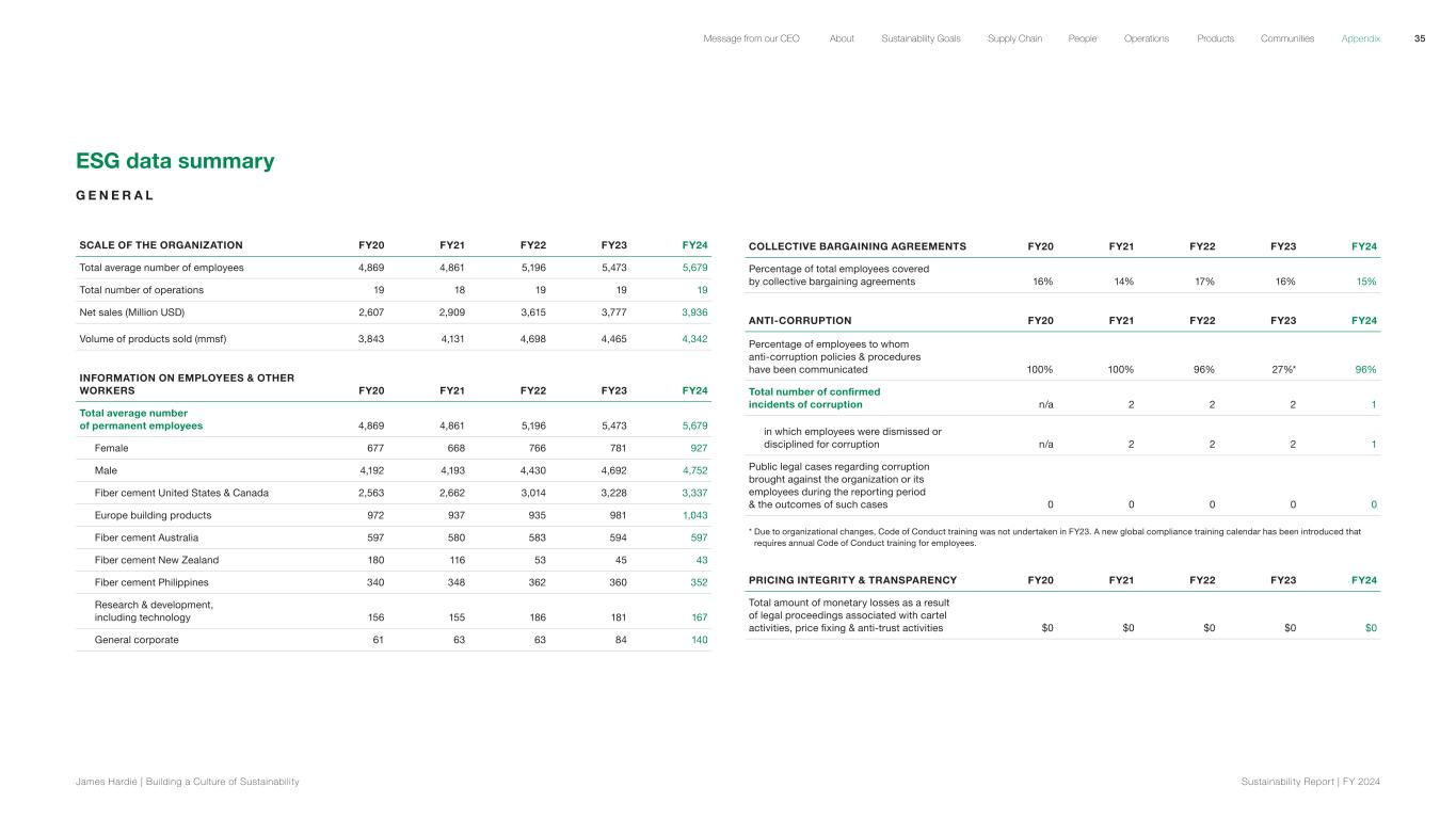 ESG data summary G E N E R A L SCALE OF THE ORGANIZATION FY20 FY21 FY22 FY23 FY24 Total average number of employees 4,869 4,861 5,196 5,473 5,679 Total number of operations 19 18 19 19 19 Net sales (Million USD) 2,607 2,909 3,615 3,777 3,936 Volume of products sold (mmsf) 3,843 4,131 4,698 4,465 4,342 INFORMATION ON EMPLOYEES & OTHER WORKERS FY20 FY21 FY22 FY23 FY24 Total average number of permanent employees 4,869 4,861 5,196 5,473 5,679 Female 677 668 766 781 927 Male 4,192 4,193 4,430 4,692 4,752 Fiber cement United States & Canada 2,563 2,662 3,014 3,228 3,337 Europe building products 972 937 935 981 1,043 Fiber cement Australia 597 580 583 594 597 Fiber cement New Zealand 180 116 53 45 43 Fiber cement Philippines 340 348 362 360 352 Research & development, including technology 156 155 186 181 167 General corporate 61 63 63 84 140 COLLECTIVE BARGAINING AGREEMENTS FY20 FY21 FY22 FY23 FY24 Percentage of total employees covered by collective bargaining agreements 16% 14% 17% 16% 15% ANTI-CORRUPTION FY20 FY21 FY22 FY23 FY24 Percentage of employees to whom anti-corruption policies & procedures have been communicated 100% 100% 96% 27%* 96% Total number of confirmed incidents of corruption n/a 2 2 2 1 in which employees were dismissed or disciplined for corruption n/a 2 2 2 1 Public legal cases regarding corruption brought against the organization or its employees during the reporting period & the outcomes of such cases 0 0 0 0 0 * Due to organizational changes, Code of Conduct training was not undertaken in FY23. A new global compliance training calendar has been introduced that requires annual Code of Conduct training for employees. PRICING INTEGRITY & TRANSPARENCY FY20 FY21 FY22 FY23 FY24 Total amount of monetary losses as a result of legal proceedings associated with cartel activities, price fixing & anti-trust activities $0 $0 $0 $0 $0 35 James Hardie | Building a Culture of Sustainability Sustainability Repor t | FY 2024 About Sustainability Goals Supply Chain OperationsMessage from our CEO People Products Communities Appendix