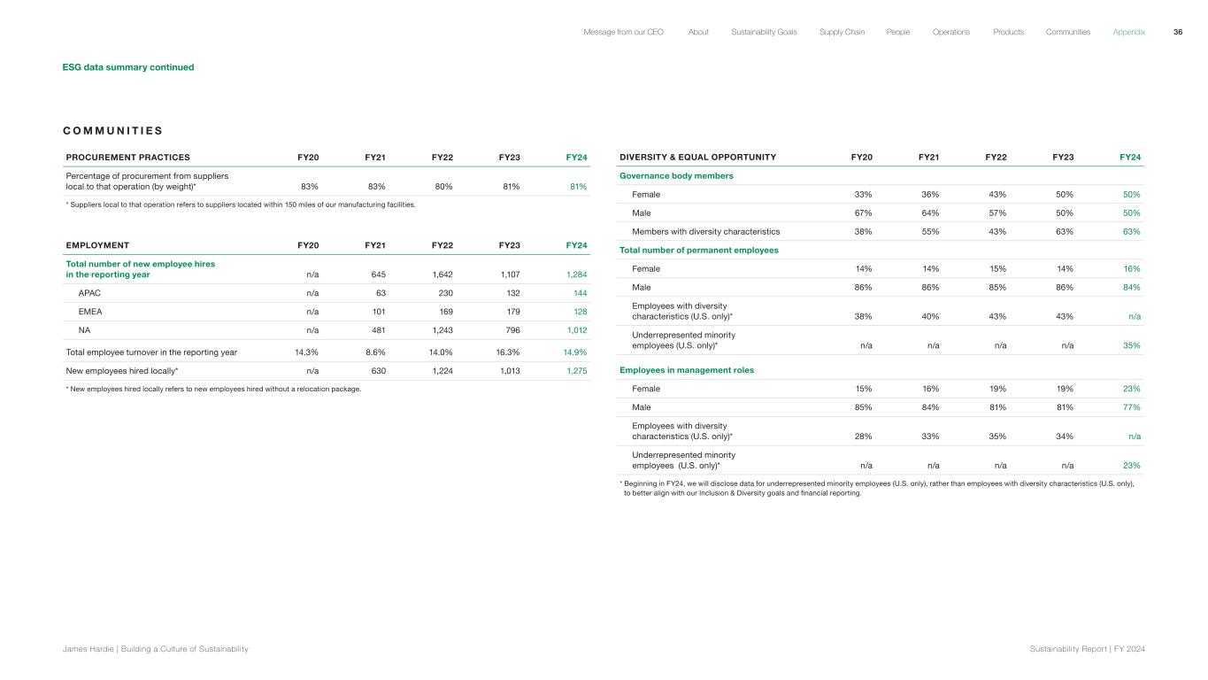 C O M M U N I T I E S PROCUREMENT PRACTICES FY20 FY21 FY22 FY23 FY24 Percentage of procurement from suppliers local to that operation (by weight)* 83% 83% 80% 81% 81% * Suppliers local to that operation refers to suppliers located within 150 miles of our manufacturing facilities. EMPLOYMENT FY20 FY21 FY22 FY23 FY24 Total number of new employee hires in the reporting year n/a 645 1,642 1,107 1,284 APAC n/a 63 230 132 144 EMEA n/a 101 169 179 128 NA n/a 481 1,243 796 1,012 Total employee turnover in the reporting year 14.3% 8.6% 14.0% 16.3% 14.9% New employees hired locally* n/a 630 1,224 1,013 1,275 * New employees hired locally refers to new employees hired without a relocation package. DIVERSITY & EQUAL OPPORTUNITY FY20 FY21 FY22 FY23 FY24 Governance body members Female 33% 36% 43% 50% 50% Male 67% 64% 57% 50% 50% Members with diversity characteristics 38% 55% 43% 63% 63% Total number of permanent employees Female 14% 14% 15% 14% 16% Male 86% 86% 85% 86% 84% Employees with diversity characteristics (U.S. only)* 38% 40% 43% 43% n/a Underrepresented minority employees (U.S. only)* n/a n/a n/a n/a 35% Employees in management roles Female 15% 16% 19% 19% 23% Male 85% 84% 81% 81% 77% Employees with diversity characteristics (U.S. only)* 28% 33% 35% 34% n/a Underrepresented minority employees (U.S. only)* n/a n/a n/a n/a 23% * Beginning in FY24, we will disclose data for underrepresented minority employees (U.S. only), rather than employees with diversity characteristics (U.S. only), to better align with our Inclusion & Diversity goals and financial reporting. ESG data summary continued 36 James Hardie | Building a Culture of Sustainability Sustainability Repor t | FY 2024 About Sustainability Goals Supply Chain OperationsMessage from our CEO People Products Communities Appendix