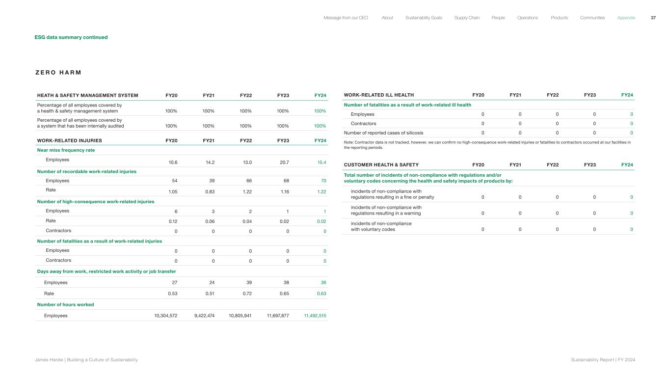 Z E R O H A R M HEATH & SAFETY MANAGEMENT SYSTEM FY20 FY21 FY22 FY23 FY24 Percentage of all employees covered by a health & safety management system 100% 100% 100% 100% 100% Percentage of all employees covered by a system that has been internally audited 100% 100% 100% 100% 100% WORK-RELATED INJURIES FY20 FY21 FY22 FY23 FY24 Near miss frequency rate Employees 10.6 14.2 13.0 20.7 15.4 Number of recordable work-related injuries Employees 54 39 66 68 70 Rate 1.05 0.83 1.22 1.16 1.22 Number of high-consequence work-related injuries Employees 6 3 2 1 1 Rate 0.12 0.06 0.04 0.02 0.02 Contractors 0 0 0 0 0 Number of fatalities as a result of work-related injuries Employees 0 0 0 0 0 Contractors 0 0 0 0 0 Days away from work, restricted work activity or job transfer Employees 27 24 39 38 36 Rate 0.53 0.51 0.72 0.65 0.63 Number of hours worked Employees 10,304,572 9,422,474 10,805,941 11,697,877 11,492,515 WORK-RELATED ILL HEALTH FY20 FY21 FY22 FY23 FY24 Number of fatalities as a result of work-related ill health Employees 0 0 0 0 0 Contractors 0 0 0 0 0 Number of reported cases of silicosis 0 0 0 0 0 Note: Contractor data is not tracked, however, we can confirm no high-consequence work-related injuries or fatalities to contractors occurred at our facilities in the reporting periods. CUSTOMER HEALTH & SAFETY FY20 FY21 FY22 FY23 FY24 Total number of incidents of non-compliance with regulations and/or voluntary codes concerning the health and safety impacts of products by: incidents of non-compliance with regulations resulting in a fine or penalty 0 0 0 0 0 incidents of non-compliance with regulations resulting in a warning 0 0 0 0 0 incidents of non-compliance with voluntary codes 0 0 0 0 0 ESG data summary continued 37 James Hardie | Building a Culture of Sustainability Sustainability Repor t | FY 2024 About Sustainability Goals Supply Chain OperationsMessage from our CEO People Products Communities Appendix