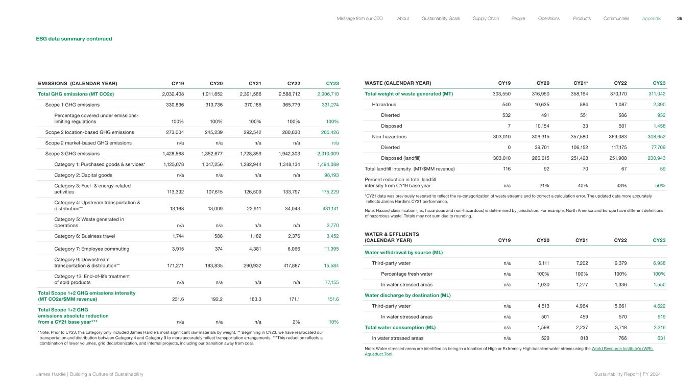 EMISSIONS (CALENDAR YEAR) CY19 CY20 CY21 CY22 CY23 Total GHG emissions (MT CO2e) 2,032,408 1,911,652 2,391,586 2,588,712 2,906,710 Scope 1 GHG emissions 330,836 313,736 370,185 365,779 331,274 Percentage covered under emissions- limiting regulations 100% 100% 100% 100% 100% Scope 2 location-based GHG emissions 273,004 245,239 292,542 280,630 265,426 Scope 2 market-based GHG emissions n/a n/a n/a n/a n/a Scope 3 GHG emissions 1,428,568 1,352,677 1,728,859 1,942,303 2,310,009 Category 1: Purchased goods & services* 1,125,078 1,047,256 1,282,944 1,348,134 1,494,089 Category 2: Capital goods n/a n/a n/a n/a 98,193 Category 3: Fuel- & energy-related activities 113,392 107,615 126,509 133,797 175,229 Category 4: Upstream transportation & distribution** 13,168 13,009 22,911 34,043 431,141 Category 5: Waste generated in operations n/a n/a n/a n/a 3,770 Category 6: Business travel 1,744 588 1,182 2,376 3,452 Category 7: Employee commuting 3,915 374 4,381 6,066 11,395 Category 9: Downstream transportation & distribution** 171,271 183,835 290,932 417,887 15,584 Category 12: End-of-life treatment of sold products n/a n/a n/a n/a 77,155 Total Scope 1+2 GHG emissions intensity (MT CO2e/$MM revenue) 231.6 192.2 183.3 171.1 151.6 Total Scope 1+2 GHG emissions absolute reduction from a CY21 base year*** n/a n/a n/a 2% 10% * Note: Prior to CY23, this category only included James Hardie's most significant raw materials by weight. ** Beginning in CY23, we have reallocated our transportation and distribution between Category 4 and Category 9 to more accurately reflect transportation arrangements. ***This reduction reflects a combination of lower volumes, grid decarbonization, and internal projects, including our transition away from coal. WASTE (CALENDAR YEAR) CY19 CY20 CY21* CY22 CY23 Total weight of waste generated (MT) 303,550 316,950 358,164 370,170 311,042 Hazardous 540 10,635 584 1,087 2,390 Diverted 532 491 551 586 932 Disposed 7 10,154 33 501 1,458 Non-hazardous 303,010 306,315 357,580 369,083 308,652 Diverted 0 39,701 106,152 117,175 77,709 Disposed (landfill) 303,010 266,615 251,428 251,908 230,943 Total landfill intensity (MT/$MM revenue) 116 92 70 67 59 Percent reduction in total landfill intensity from CY19 base year n/a 21% 40% 43% 50% * CY21 data was previously restated to reflect the re-categorization of waste streams and to correct a calculation error. The updated data more accurately reflects James Hardie's CY21 performance. Note: Hazard classification (i.e., hazardous and non-hazardous) is determined by jurisdiction. For example, North America and Europe have different definitions of hazardous waste. Totals may not sum due to rounding. WATER & EFFLUENTS (CALENDAR YEAR) CY19 CY20 CY21 CY22 CY23 Water withdrawal by source (ML) Third-party water n/a 6,111 7,202 9,379 6,938 Percentage fresh water n/a 100% 100% 100% 100% In water stressed areas n/a 1,030 1,277 1,336 1,550 Water discharge by destination (ML) Third-party water n/a 4,513 4,964 5,661 4,622 In water stressed areas n/a 501 459 570 919 Total water consumption (ML) n/a 1,598 2,237 3,718 2,316 In water stressed areas n/a 529 818 766 631 Note: Water stressed areas are identified as being in a location of High or Extremely High baseline water stress using the World Resource Institute's (WRI) Aqueduct Tool. ESG data summary continued 39 James Hardie | Building a Culture of Sustainability Sustainability Repor t | FY 2024 About Sustainability Goals Supply Chain OperationsMessage from our CEO People Products Communities Appendix