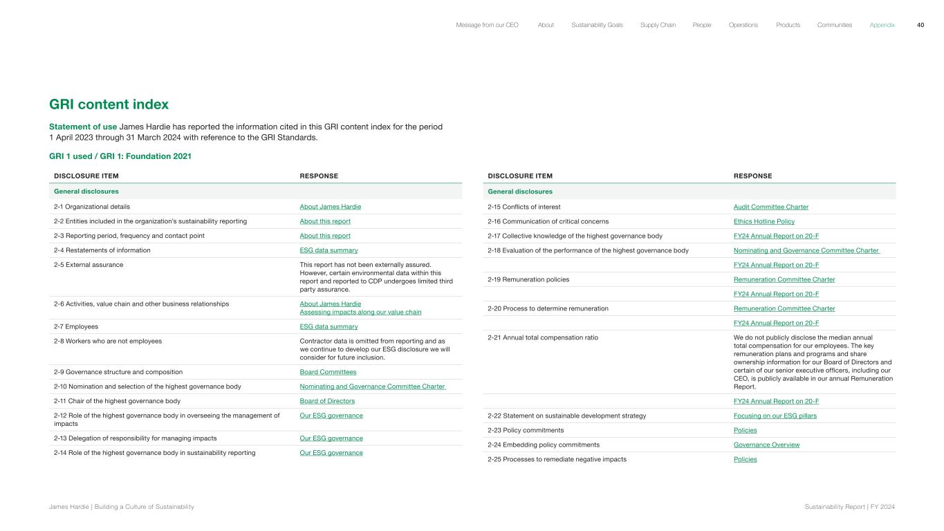 GRI content index Statement of use James Hardie has reported the information cited in this GRI content index for the period 1 April 2023 through 31 March 2024 with reference to the GRI Standards. GRI 1 used / GRI 1: Foundation 2021 DISCLOSURE ITEM RESPONSE General disclosures 2-1 Organizational details About James Hardie 2-2 Entities included in the organization’s sustainability reporting About this report 2-3 Reporting period, frequency and contact point About this report 2-4 Restatements of information ESG data summary 2-5 External assurance This report has not been externally assured. However, certain environmental data within this report and reported to CDP undergoes limited third party assurance. 2-6 Activities, value chain and other business relationships About James Hardie Assessing impacts along our value chain 2-7 Employees ESG data summary 2-8 Workers who are not employees Contractor data is omitted from reporting and as we continue to develop our ESG disclosure we will consider for future inclusion. 2-9 Governance structure and composition Board Committees 2-10 Nomination and selection of the highest governance body Nominating and Governance Committee Charter 2-11 Chair of the highest governance body Board of Directors 2-12 Role of the highest governance body in overseeing the management of impacts Our ESG governance 2-13 Delegation of responsibility for managing impacts Our ESG governance 2-14 Role of the highest governance body in sustainability reporting Our ESG governance DISCLOSURE ITEM RESPONSE General disclosures 2-15 Conflicts of interest Audit Committee Charter 2-16 Communication of critical concerns Ethics Hotline Policy 2-17 Collective knowledge of the highest governance body FY24 Annual Report on 20-F 2-18 Evaluation of the performance of the highest governance body Nominating and Governance Committee Charter FY24 Annual Report on 20-F 2-19 Remuneration policies Remuneration Committee Charter FY24 Annual Report on 20-F 2-20 Process to determine remuneration Remuneration Committee Charter FY24 Annual Report on 20-F 2-21 Annual total compensation ratio We do not publicly disclose the median annual total compensation for our employees. The key remuneration plans and programs and share ownership information for our Board of Directors and certain of our senior executive officers, including our CEO, is publicly available in our annual Remuneration Report. FY24 Annual Report on 20-F 2-22 Statement on sustainable development strategy Focusing on our ESG pillars 2-23 Policy commitments Policies 2-24 Embedding policy commitments Governance Overview 2-25 Processes to remediate negative impacts Policies 40 James Hardie | Building a Culture of Sustainability Sustainability Repor t | FY 2024 About Sustainability Goals Supply Chain OperationsMessage from our CEO People Products Communities Appendix