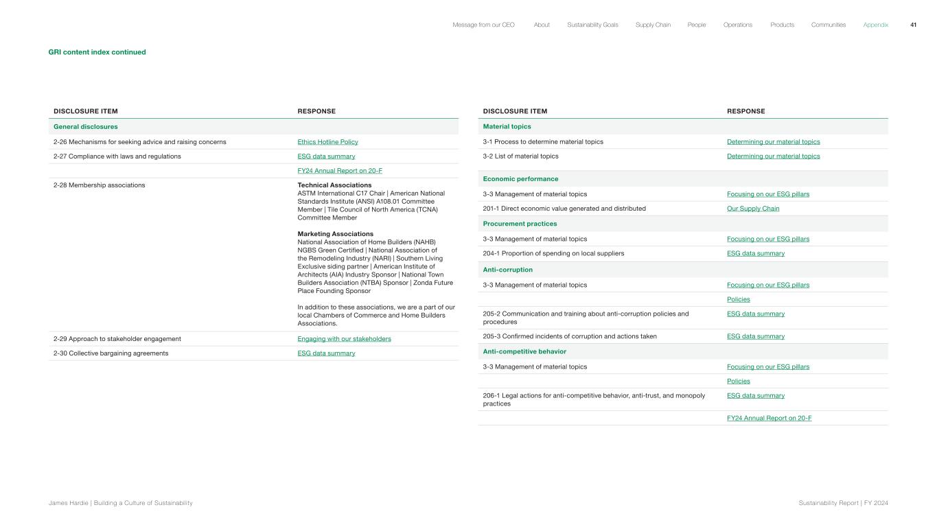 DISCLOSURE ITEM RESPONSE General disclosures 2-26 Mechanisms for seeking advice and raising concerns Ethics Hotline Policy 2-27 Compliance with laws and regulations ESG data summary FY24 Annual Report on 20-F 2-28 Membership associations Technical Associations ASTM International C17 Chair | American National Standards Institute (ANSI) A108.01 Committee Member | Tile Council of North America (TCNA) Committee Member Marketing Associations National Association of Home Builders (NAHB) NGBS Green Certified | National Association of the Remodeling Industry (NARI) | Southern Living Exclusive siding partner | American Institute of Architects (AIA) Industry Sponsor | National Town Builders Association (NTBA) Sponsor | Zonda Future Place Founding Sponsor In addition to these associations, we are a part of our local Chambers of Commerce and Home Builders Associations. 2-29 Approach to stakeholder engagement Engaging with our stakeholders 2-30 Collective bargaining agreements ESG data summary DISCLOSURE ITEM RESPONSE Material topics 3-1 Process to determine material topics Determining our material topics 3-2 List of material topics Determining our material topics Economic performance 3-3 Management of material topics Focusing on our ESG pillars 201-1 Direct economic value generated and distributed Our Supply Chain Procurement practices 3-3 Management of material topics Focusing on our ESG pillars 204-1 Proportion of spending on local suppliers ESG data summary Anti-corruption 3-3 Management of material topics Focusing on our ESG pillars Policies 205-2 Communication and training about anti-corruption policies and procedures ESG data summary 205-3 Confirmed incidents of corruption and actions taken ESG data summary Anti-competitive behavior 3-3 Management of material topics Focusing on our ESG pillars Policies 206-1 Legal actions for anti-competitive behavior, anti-trust, and monopoly practices ESG data summary FY24 Annual Report on 20-F GRI content index continued 41 James Hardie | Building a Culture of Sustainability Sustainability Repor t | FY 2024 About Sustainability Goals Supply Chain OperationsMessage from our CEO People Products Communities Appendix