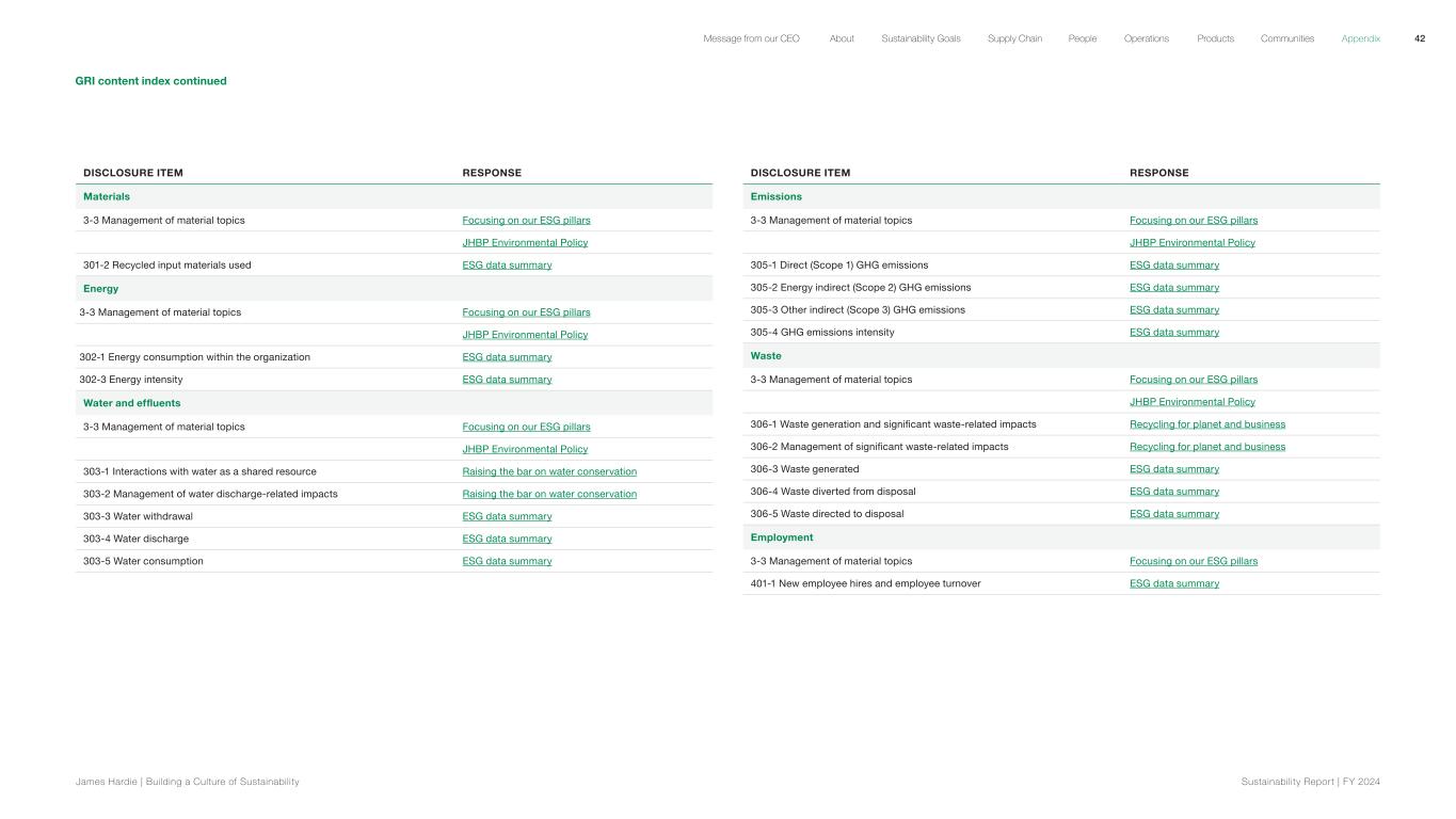 DISCLOSURE ITEM RESPONSE Materials 3-3 Management of material topics Focusing on our ESG pillars JHBP Environmental Policy 301-2 Recycled input materials used ESG data summary Energy 3-3 Management of material topics Focusing on our ESG pillars JHBP Environmental Policy 302-1 Energy consumption within the organization ESG data summary 302-3 Energy intensity ESG data summary Water and effluents 3-3 Management of material topics Focusing on our ESG pillars JHBP Environmental Policy 303-1 Interactions with water as a shared resource Raising the bar on water conservation 303-2 Management of water discharge-related impacts Raising the bar on water conservation 303-3 Water withdrawal ESG data summary 303-4 Water discharge ESG data summary 303-5 Water consumption ESG data summary DISCLOSURE ITEM RESPONSE Emissions 3-3 Management of material topics Focusing on our ESG pillars JHBP Environmental Policy 305-1 Direct (Scope 1) GHG emissions ESG data summary 305-2 Energy indirect (Scope 2) GHG emissions ESG data summary 305-3 Other indirect (Scope 3) GHG emissions ESG data summary 305-4 GHG emissions intensity ESG data summary Waste 3-3 Management of material topics Focusing on our ESG pillars JHBP Environmental Policy 306-1 Waste generation and significant waste-related impacts Recycling for planet and business 306-2 Management of significant waste-related impacts Recycling for planet and business 306-3 Waste generated ESG data summary 306-4 Waste diverted from disposal ESG data summary 306-5 Waste directed to disposal ESG data summary Employment 3-3 Management of material topics Focusing on our ESG pillars 401-1 New employee hires and employee turnover ESG data summary GRI content index continued 42 James Hardie | Building a Culture of Sustainability Sustainability Repor t | FY 2024 About Sustainability Goals Supply Chain OperationsMessage from our CEO People Products Communities Appendix