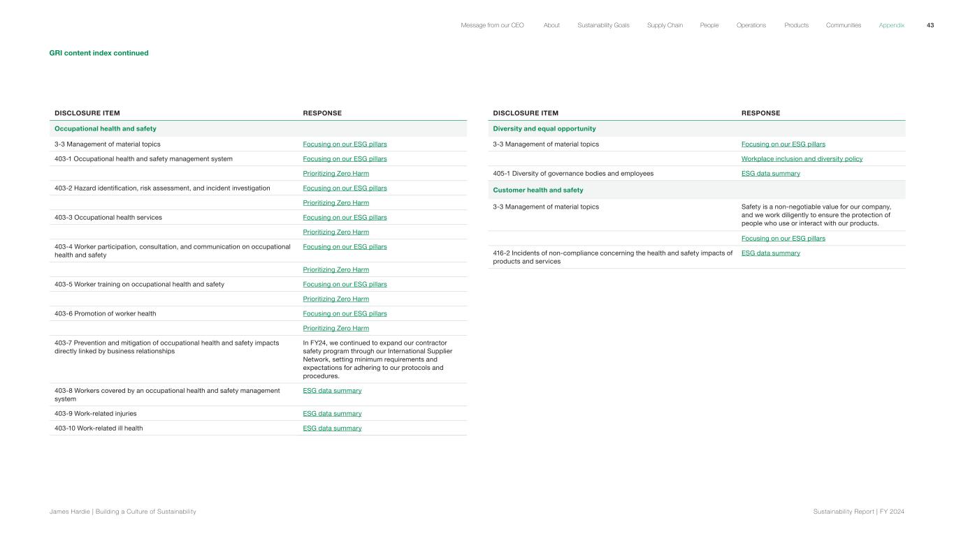 DISCLOSURE ITEM RESPONSE Occupational health and safety 3-3 Management of material topics Focusing on our ESG pillars 403-1 Occupational health and safety management system Focusing on our ESG pillars Prioritizing Zero Harm 403-2 Hazard identification, risk assessment, and incident investigation Focusing on our ESG pillars Prioritizing Zero Harm 403-3 Occupational health services Focusing on our ESG pillars Prioritizing Zero Harm 403-4 Worker participation, consultation, and communication on occupational health and safety Focusing on our ESG pillars Prioritizing Zero Harm 403-5 Worker training on occupational health and safety Focusing on our ESG pillars Prioritizing Zero Harm 403-6 Promotion of worker health Focusing on our ESG pillars Prioritizing Zero Harm 403-7 Prevention and mitigation of occupational health and safety impacts directly linked by business relationships In FY24, we continued to expand our contractor safety program through our International Supplier Network, setting minimum requirements and expectations for adhering to our protocols and procedures. 403-8 Workers covered by an occupational health and safety management system ESG data summary 403-9 Work-related injuries ESG data summary 403-10 Work-related ill health ESG data summary DISCLOSURE ITEM RESPONSE Diversity and equal opportunity 3-3 Management of material topics Focusing on our ESG pillars Workplace inclusion and diversity policy 405-1 Diversity of governance bodies and employees ESG data summary Customer health and safety 3-3 Management of material topics Safety is a non-negotiable value for our company, and we work diligently to ensure the protection of people who use or interact with our products. Focusing on our ESG pillars 416-2 Incidents of non-compliance concerning the health and safety impacts of products and services ESG data summary GRI content index continued 43 James Hardie | Building a Culture of Sustainability Sustainability Repor t | FY 2024 About Sustainability Goals Supply Chain OperationsMessage from our CEO People Products Communities Appendix