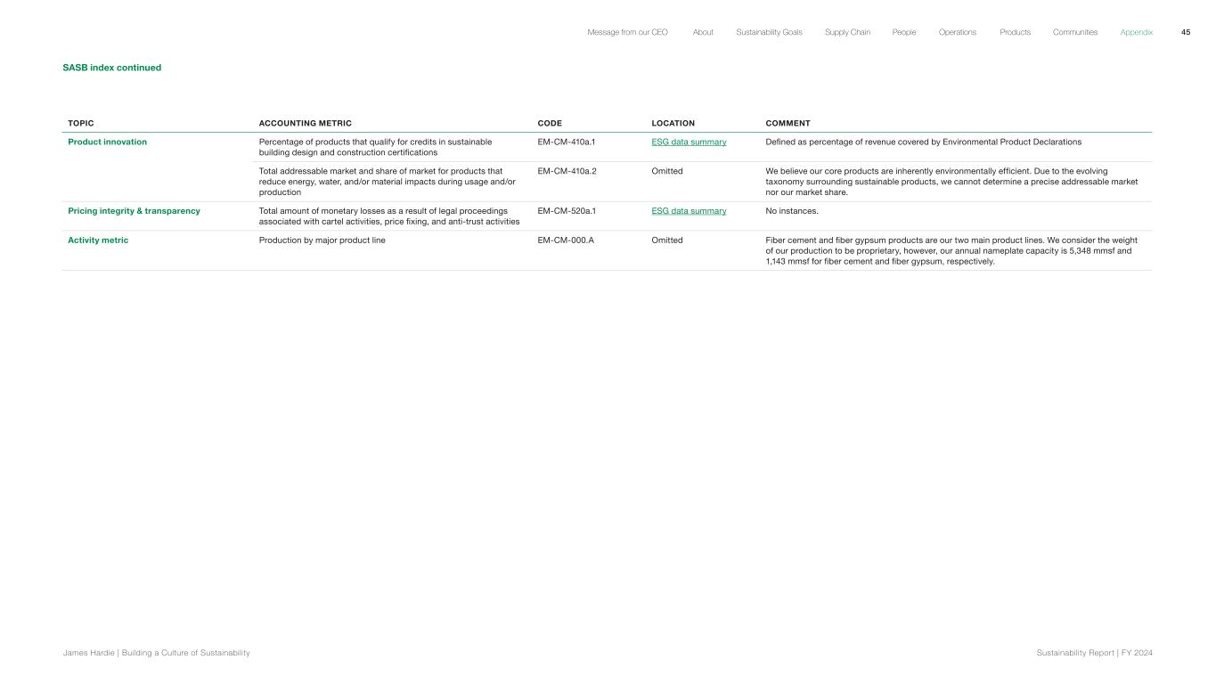 TOPIC ACCOUNTING METRIC CODE LOCATION COMMENT Product innovation Percentage of products that qualify for credits in sustainable building design and construction certifications EM-CM-410a.1 ESG data summary Defined as percentage of revenue covered by Environmental Product Declarations Total addressable market and share of market for products that reduce energy, water, and/or material impacts during usage and/or production EM-CM-410a.2 Omitted We believe our core products are inherently environmentally efficient. Due to the evolving taxonomy surrounding sustainable products, we cannot determine a precise addressable market nor our market share. Pricing integrity & transparency Total amount of monetary losses as a result of legal proceedings associated with cartel activities, price fixing, and anti-trust activities EM-CM-520a.1 ESG data summary No instances. Activity metric Production by major product line EM-CM-000.A Omitted Fiber cement and fiber gypsum products are our two main product lines. We consider the weight of our production to be proprietary, however, our annual nameplate capacity is 5,348 mmsf and 1,143 mmsf for fiber cement and fiber gypsum, respectively. SASB index continued 45 James Hardie | Building a Culture of Sustainability Sustainability Repor t | FY 2024 About Sustainability Goals Supply Chain OperationsMessage from our CEO People Products Communities Appendix