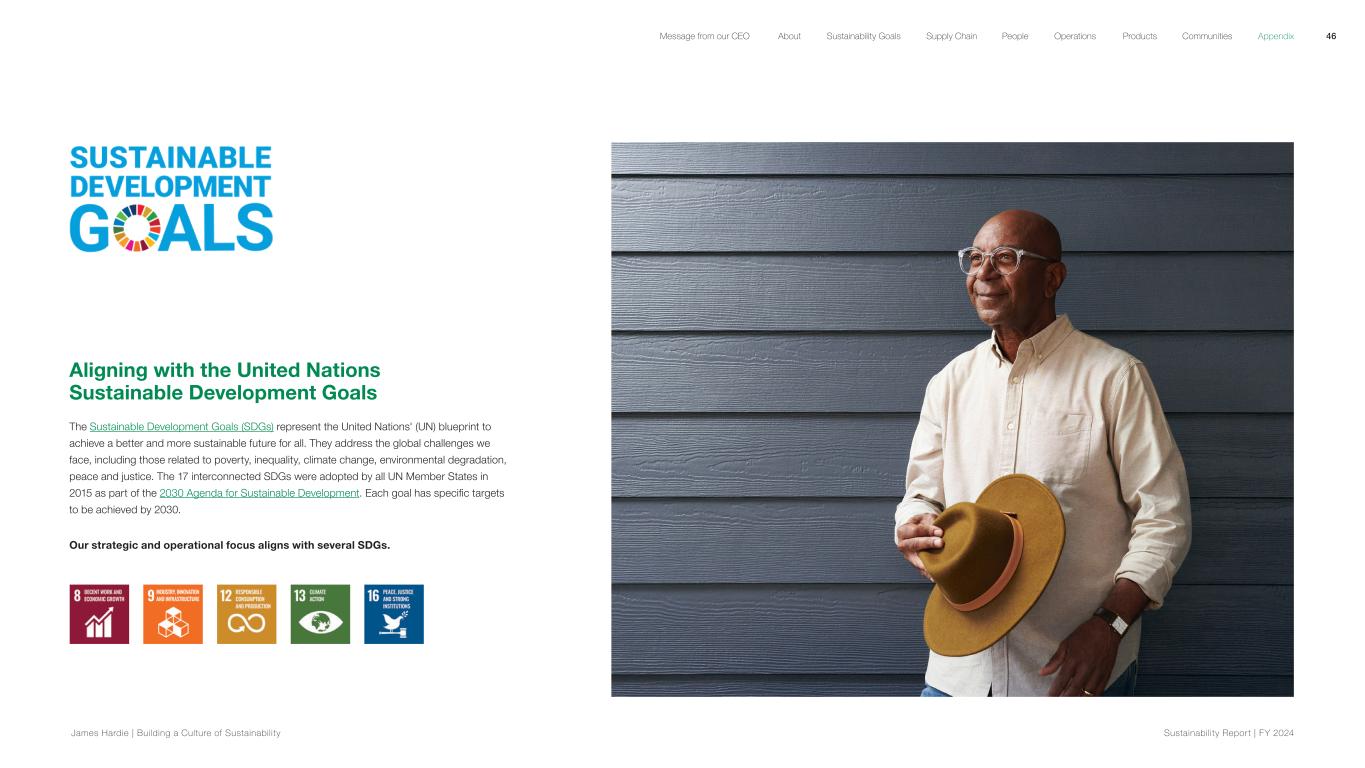 Aligning with the United Nations Sustainable Development Goals The Sustainable Development Goals (SDGs) represent the United Nations' (UN) blueprint to achieve a better and more sustainable future for all. They address the global challenges we face, including those related to poverty, inequality, climate change, environmental degradation, peace and justice. The 17 interconnected SDGs were adopted by all UN Member States in 2015 as part of the 2030 Agenda for Sustainable Development. Each goal has specific targets to be achieved by 2030. Our strategic and operational focus aligns with several SDGs. 46 James Hardie | Building a Culture of Sustainability Sustainability Repor t | FY 2024 About Sustainability Goals Supply Chain OperationsMessage from our CEO People Products Communities Appendix