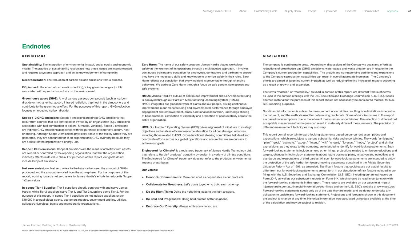 © 2024 James Hardie Building Products Inc. All Rights Reserved. TM, SM, and ® denote trademarks or registered trademarks of James Hardie Technology Limited. HS2426 08/2024 Endnotes D E F I N I T I O N S Sustainability: The integration of environmental impact, social equity and economic vitality. The practice of sustainability recognizes how these issues are interconnected and requires a systems approach and an acknowledgement of complexity. Decarbonization: The reduction of carbon dioxide emissions from a process. CO2 impact: The effect of carbon dioxide (CO2), a key greenhouse gas (GHG), associated with a product or activity on the environment. Greenhouse gases (GHG): Any of various gaseous compounds (such as carbon dioxide or methane) that absorb infrared radiation, trap heat in the atmosphere and contribute to the greenhouse effect. For the purposes of this report, GHG reduction focuses on reducing carbon dioxide. Scope 1+2 GHG emissions: Scope 1 emissions are direct GHG emissions that occur from sources that are controlled or owned by an organization (e.g., emissions associated with fuel combustion in boilers, furnaces, vehicles). Scope 2 emissions are indirect GHG emissions associated with the purchase of electricity, steam, heat or cooling. Although Scope 2 emissions physically occur at the facility where they are generated, they are accounted for in an organization’s GHG inventory because they are a result of the organization’s energy use. Scope 3 GHG emissions: Scope 3 emissions are the result of activities from assets not owned or controlled by the reporting organization, but that the organization indirectly affects in its value chain. For purposes of this report, our goals do not include Scope 3 emissions. Net zero emissions: Net zero refers to the balance between the amount of GHGs produced and the amount removed from the atmosphere. For the purposes of this report, working towards net zero refers to James Hardie’s efforts to reduce its Scope 1+2 emissions. In-scope Tier 1 Supplier: Tier 1 suppliers directly contract with and serve James Hardie, while Tier 2 suppliers serve Tier 1, and Tier 3 suppliers serve Tier 2. For the purpose of this report, in-scope Tier 1 suppliers do not include suppliers under $10,000 in annual global spend, customers rebates, government entities, utilities, colleges/universities, banks and membership organizations. Zero Harm: The name of our safety program: James Hardie places workplace safety at the forefront of its operations through a multifaceted approach. It involves continuous training and education for employees, contractors and partners to ensure they have the necessary skills and knowledge to prioritize safety in their roles. Zero Harm reflects our conviction that every incident is preventable through changing behaviors. We address Zero Harm through a focus on safe people, safe spaces and safe systems. HMOS: James Hardie’s culture of continuous improvement and LEAN manufacturing is deployed through our Hardie™ Manufacturing Operating System (HMOS). HMOS integrates our global network of plants and our people, driving continuous improvement in our manufacturing and environmental performance through employee engagement and empowerment, cross-functional collaboration, knowledge sharing of best practices, elimination of variability and promotion of accountability across the entire organization. HOS: Our Hardie™ Operating System (HOS) drives alignment of initiatives to strategic objectives and enables efficient resource allocation for all our strategic initiatives, including those related to ESG. Cross-functional steering committees help lead and coordinate efforts across our global operations and ensure that we are on track to achieve our goals. Engineered for Climate® is a registered trademark of James Hardie Technology Ltd. that refers to Hardie® products’ durability by design in a variety of climate conditions. The Engineered for Climate® trademark does not refer to the products’ environmental impacts or attributes. Our Values: + Honor Our Commitments: Make our word as dependable as our products. + Collaborate for Greatness: Let’s come together to build each other up. + Do the Right Thing: Doing the right thing leads to the right answers. + Be Bold and Progressive: Being bold creates better solutions. + Embrace Our Diversity: Always embrace who you are. D I S C L A I M E R S The company is continuing to grow. Accordingly, discussions of the Company’s goals and efforts at reductions of greenhouse gas (GHG) emissions, water usage and waste creation are in relation to the Company’s current production capabilities. The growth and corresponding additions and expansions to the Company’s production capabilities can result in overall aggregate increases. The Company’s efforts are aimed at targeting current impacts as well as reducing/limiting increased impacts occurring as a result of growth and expansion. The terms “material” or “materiality,” as used in context of this report, are different from such terms as used in the context of filings with the U.S. Securities and Exchange Commission (U.S. SEC). Issues deemed material for the purposes of this report should not necessarily be considered material for U.S. SEC reporting purposes. Non-financial information is subject to measurement uncertainties resulting from limitations inherent in the nature of, and the methods used for determining, such data. Some of our disclosures in this report are based on assumptions due to the inherent measurement uncertainties. The selection of different but acceptable measurement techniques can result in materially different measurements. The precision of different measurement techniques may also vary. This report contains certain forward-looking statements based on our current assumptions and expectations, which are subject to various substantial risks and uncertainties. The words “anticipate,” “plan,” “goal,” “estim