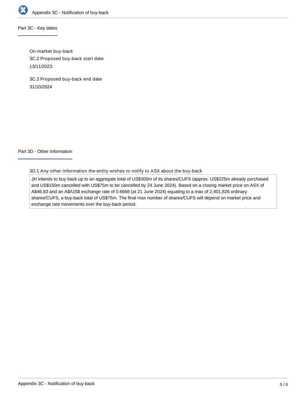 Appendix 3C - Notification of buy-back Appendix 3C - Notification of buy-back 5 / 6 Part 3C - Key dates On-market buy-back 3C.2 Proposed buy-back start date 13/11/2023 3C.3 Proposed buy-back end date 31/10/2024 Part 3D - Other Information 3D.1 Any other information the entity wishes to notify to ASX about the buy-back JH intends to buy back up to an aggregate total of US$300m of its shares/CUFS (approx. US$225m already purchased and US$150m cancelled with US$75m to be cancelled by 24 June 2024). Based on a closing market price on ASX of A$46.83 and an A$/US$ exchange rate of 0.6668 (at 21 June 2024) equating to a max of 2,401,826 ordinary shares/CUFS, a buy-back total of US$75m. The final max number of shares/CUFS will depend on market price and exchange rate movements over the buy-back period.