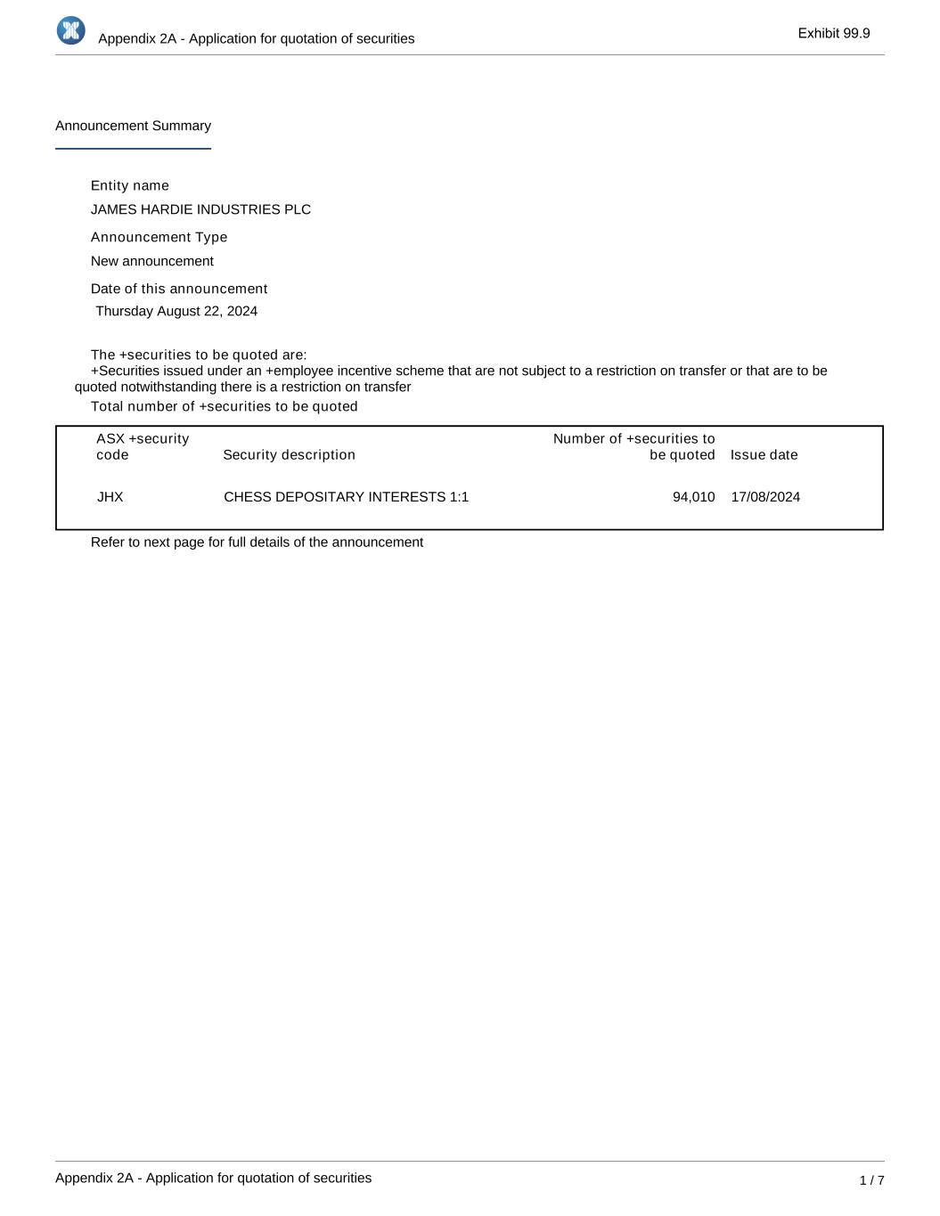 Appendix 2A - Application for quotation of securities Appendix 2A - Application for quotation of securities 1 / 7 Announcement Summary Entity name JAMES HARDIE INDUSTRIES PLC Announcement Type New announcement Date of this announcement Thursday August 22, 2024 The +securities to be quoted are: Total number of +securities to be quoted ASX +security code Security description Number of +securities to be quoted Issue date JHX CHESS DEPOSITARY INTERESTS 1:1 94,010 17/08/2024 Refer to next page for full details of the announcement +Securities issued under an +employee incentive scheme that are not subject to a restriction on transfer or that are to be quoted notwithstanding there is a restriction on transfer Exhibit 99.9
