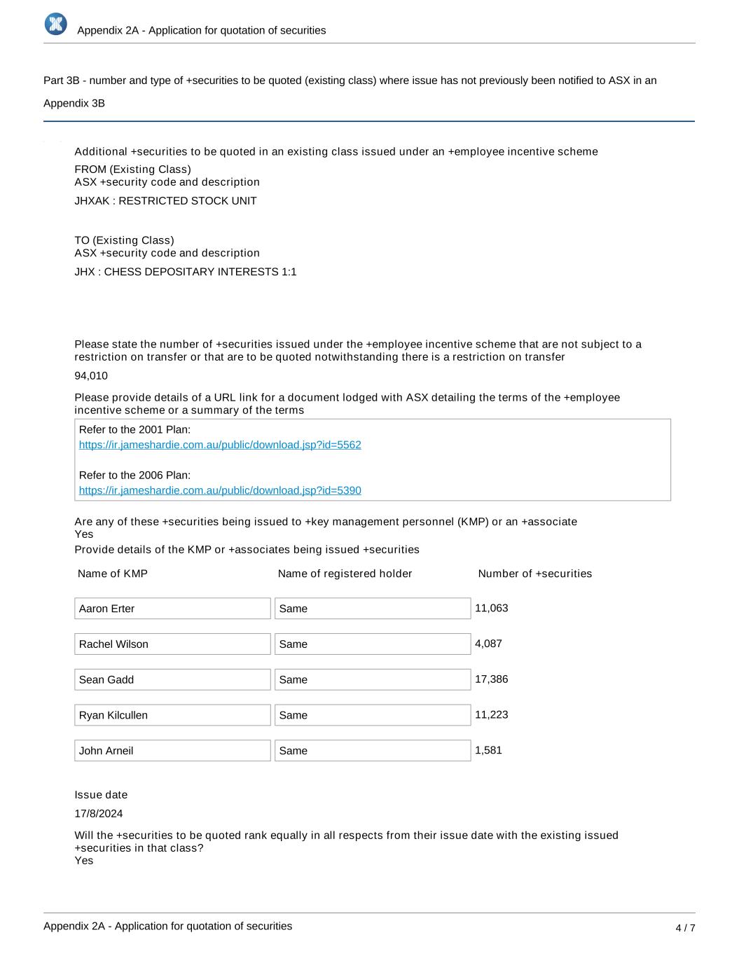 Appendix 2A - Application for quotation of securities Appendix 2A - Application for quotation of securities 4 / 7 Part 3B - number and type of +securities to be quoted (existing class) where issue has not previously been notified to ASX in an Appendix 3B Additional +securities to be quoted in an existing class issued under an +employee incentive scheme FROM (Existing Class) ASX +security code and description JHXAK : RESTRICTED STOCK UNIT TO (Existing Class) ASX +security code and description JHX : CHESS DEPOSITARY INTERESTS 1:1 Please state the number of +securities issued under the +employee incentive scheme that are not subject to a restriction on transfer or that are to be quoted notwithstanding there is a restriction on transfer 94,010 Please provide details of a URL link for a document lodged with ASX detailing the terms of the +employee incentive scheme or a summary of the terms Refer to the 2001 Plan: https://ir.jameshardie.com.au/public/download.jsp?id=5562 Refer to the 2006 Plan: https://ir.jameshardie.com.au/public/download.jsp?id=5390 Are any of these +securities being issued to +key management personnel (KMP) or an +associate Provide details of the KMP or +associates being issued +securities Name of KMP Name of registered holder Number of +securities Aaron Erter Same 11,063 Rachel Wilson Same 4,087 Sean Gadd Same 17,386 Ryan Kilcullen Same 11,223 John Arneil Same 1,581 Issue date 17/8/2024 Will the +securities to be quoted rank equally in all respects from their issue date with the existing issued +securities in that class? Yes Yes