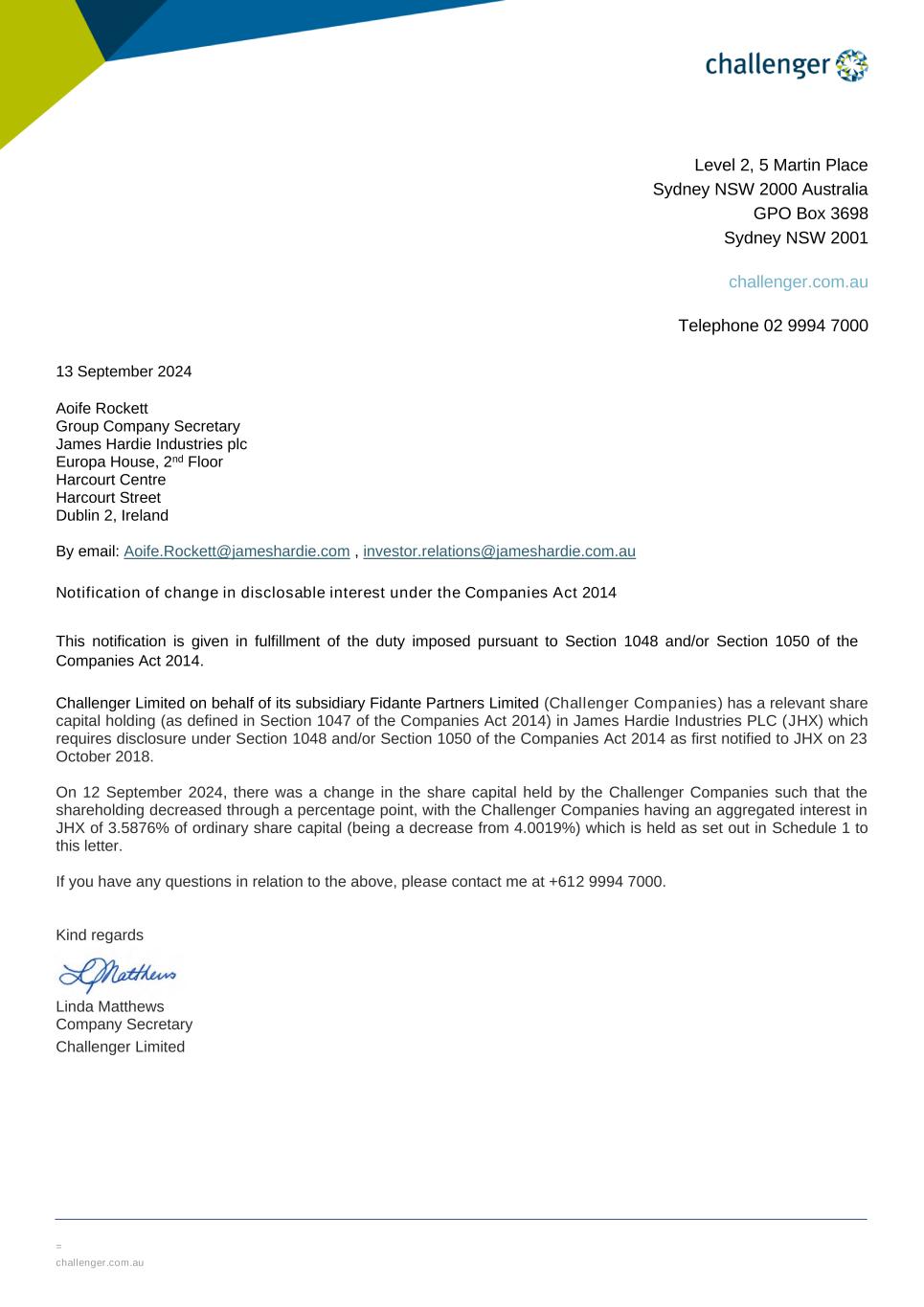 James Hardie Industries plc 1st Floor, Block A, One Park Place, Upper Hatch Street, Dublin 2, D02 FD79, Ireland T: +353 (0) 1 411 6924 F: +353 (0) 1 479 1128 James Hardie Industries plc is a limited liability company incorporated in Ireland with its registered office at 1st Floor, Block A, One Park Place, Upper Hatch Street, Dublin 2, D02 FD79, Ireland. Directors: Anne Lloyd (Chairperson, USA), Peter-John Davis (Aus), Persio Lisboa (USA), Renee Peterson (USA), John Pfeifer (USA), Rada Rodriguez (Sweden), Suzanne B. Rowland (USA), Nigel Stein (UK), Harold Wiens (USA). Chief Executive Officer and Director: Aaron Erter (USA) Company number: 485719 ARBN: 097 829 895 16 September 2024 The Manager Company Announcements Office Australian Securities Exchange Limited 20 Bridge Street SYDNEY NSW 2000 Dear Sir/Madam Substantial Holding Notice As required under ASX Listing Rule 3.17.3 please see attached copy of the substantial holding notice received by James Hardie on 13 September 2024. Regards Aoife Rockett Company Secretary This announcement has been authorised for release by the Company Secretary, Ms Aoife Rockett. Exhibit 99.3