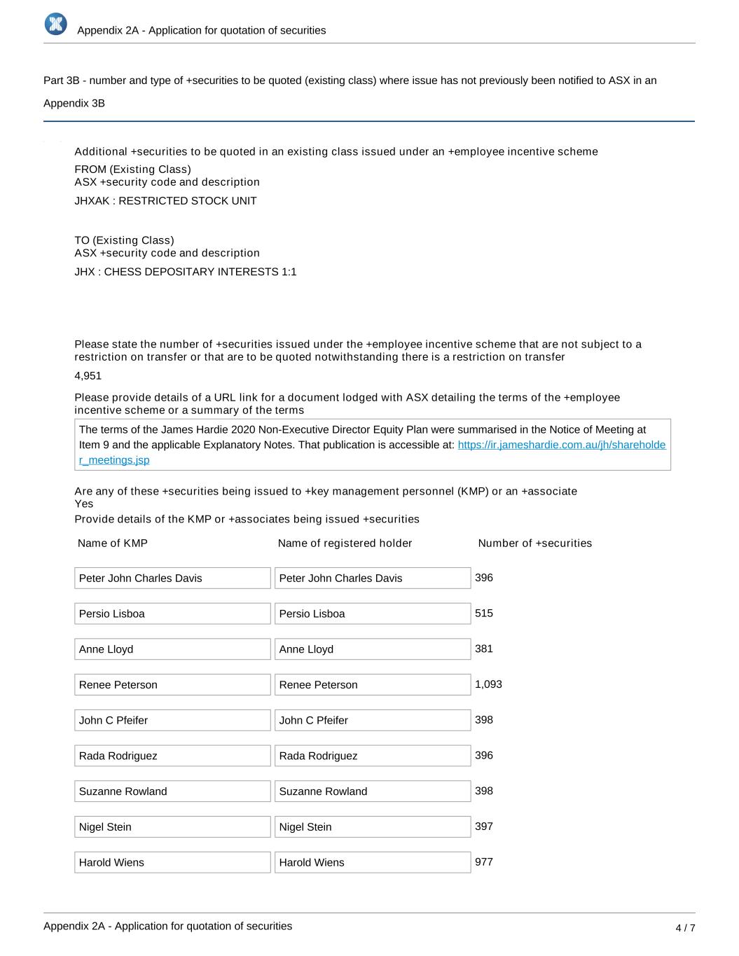 Appendix 2A - Application for quotation of securities Appendix 2A - Application for quotation of securities 4 / 7 Part 3B - number and type of +securities to be quoted (existing class) where issue has not previously been notified to ASX in an Appendix 3B Additional +securities to be quoted in an existing class issued under an +employee incentive scheme FROM (Existing Class) ASX +security code and description JHXAK : RESTRICTED STOCK UNIT TO (Existing Class) ASX +security code and description JHX : CHESS DEPOSITARY INTERESTS 1:1 Please state the number of +securities issued under the +employee incentive scheme that are not subject to a restriction on transfer or that are to be quoted notwithstanding there is a restriction on transfer 4,951 Please provide details of a URL link for a document lodged with ASX detailing the terms of the +employee incentive scheme or a summary of the terms The terms of the James Hardie 2020 Non-Executive Director Equity Plan were summarised in the Notice of Meeting at Item 9 and the applicable Explanatory Notes. That publication is accessible at: https://ir.jameshardie.com.au/jh/shareholde r_meetings.jsp Are any of these +securities being issued to +key management personnel (KMP) or an +associate Provide details of the KMP or +associates being issued +securities Name of KMP Name of registered holder Number of +securities Peter John Charles Davis Peter John Charles Davis 396 Persio Lisboa Persio Lisboa 515 Anne Lloyd Anne Lloyd 381 Renee Peterson Renee Peterson 1,093 John C Pfeifer John C Pfeifer 398 Rada Rodriguez Rada Rodriguez 396 Suzanne Rowland Suzanne Rowland 398 Nigel Stein Nigel Stein 397 Harold Wiens Harold Wiens 977 Issue date Yes