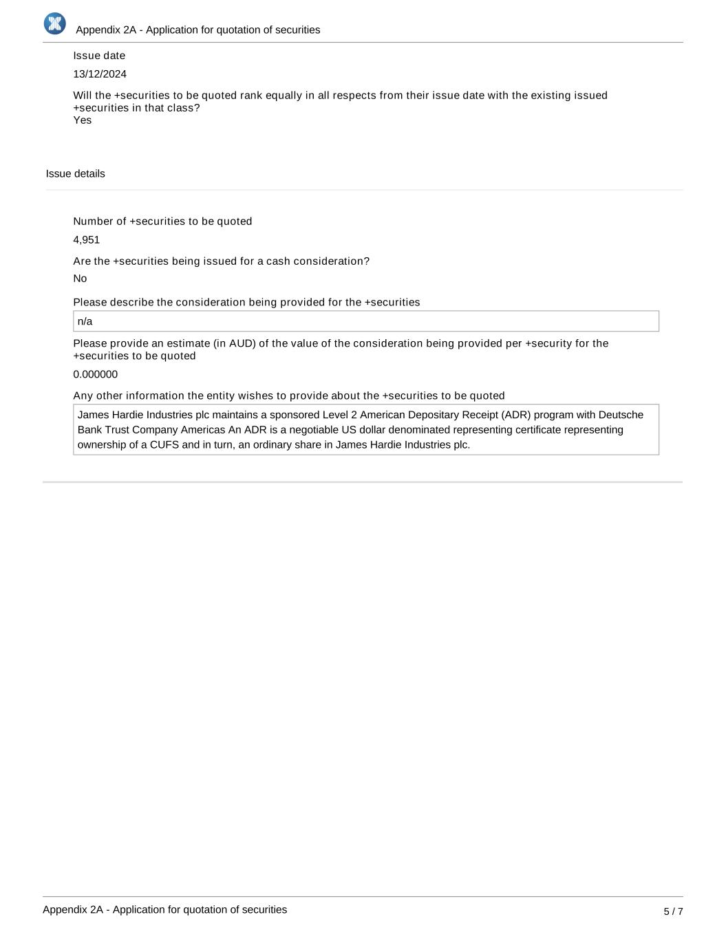Appendix 2A - Application for quotation of securities Appendix 2A - Application for quotation of securities 5 / 7 Issue date 13/12/2024 Will the +securities to be quoted rank equally in all respects from their issue date with the existing issued +securities in that class? Issue details Number of +securities to be quoted 4,951 Are the +securities being issued for a cash consideration? Please describe the consideration being provided for the +securities n/a Please provide an estimate (in AUD) of the value of the consideration being provided per +security for the +securities to be quoted 0.000000 Any other information the entity wishes to provide about the +securities to be quoted James Hardie Industries plc maintains a sponsored Level 2 American Depositary Receipt (ADR) program with Deutsche Bank Trust Company Americas An ADR is a negotiable US dollar denominated representing certificate representing ownership of a CUFS and in turn, an ordinary share in James Hardie Industries plc. No Yes