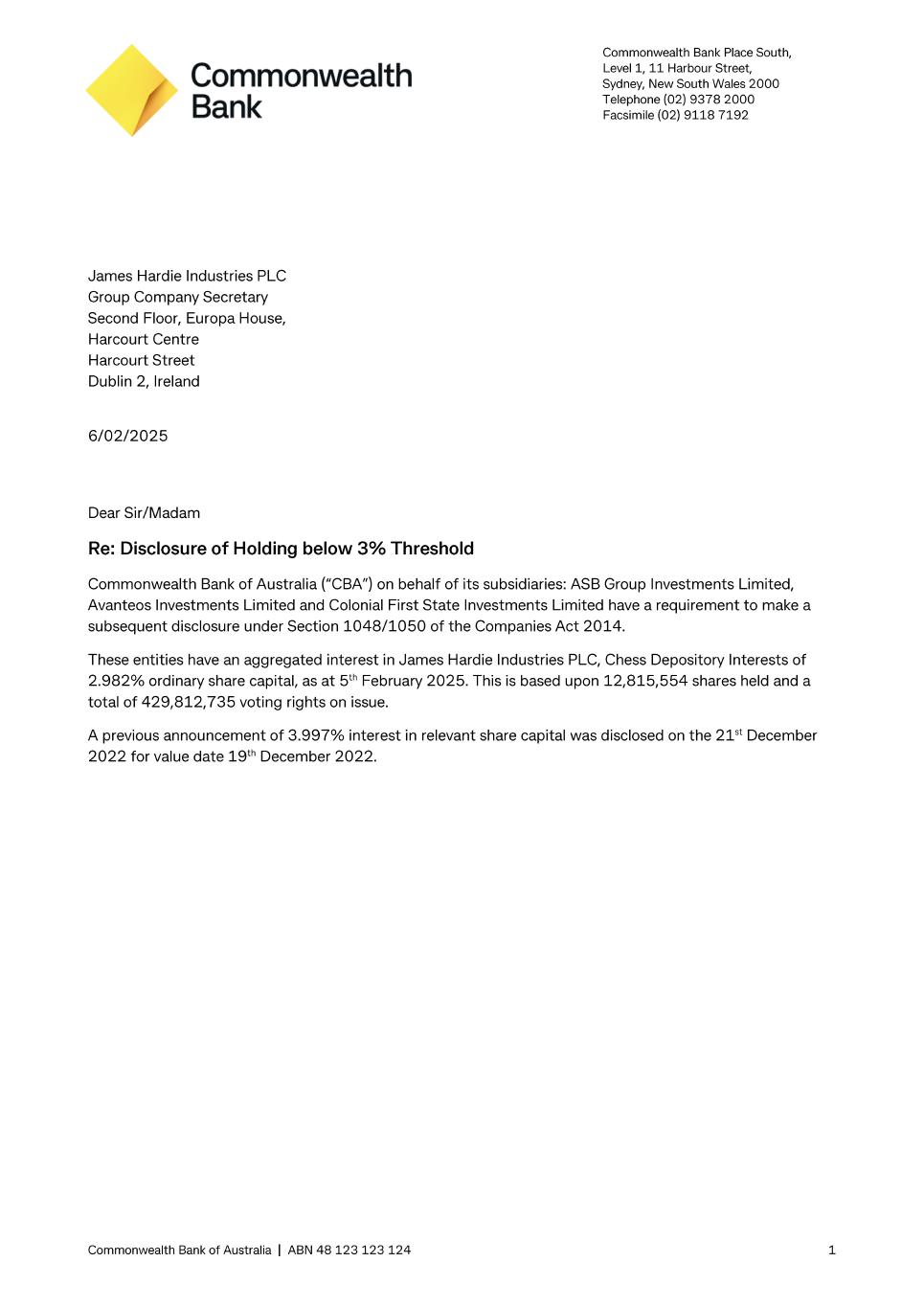 James Hardie Industries plc 1st Floor, Block A, One Park Place, Upper Hatch Street, Dublin 2, D02 FD79, Ireland T: +353 (0) 1 411 6924 F: +353 (0) 1 479 1128 James Hardie Industries plc is a limited liability company incorporated in Ireland with its registered office at 1st Floor, Block A, One Park Place, Upper Hatch Street, Dublin 2, D02 FD79, Ireland. Directors: Anne Lloyd (Chairperson, USA), Peter-John Davis (Aus), Persio Lisboa (USA), Renee Peterson (USA), John Pfeifer (USA), Rada Rodriguez (Sweden), Suzanne B. Rowland (USA), Nigel Stein (UK), Harold Wiens (USA). Chief Executive Officer and Director: Aaron Erter (USA) Company number: 485719 ARBN: 097 829 895 7 February 2025 The Manager Company Announcements Office Australian Securities Exchange Limited 20 Bridge Street SYDNEY NSW 2000 Dear Sir/Madam Substantial Holding Notice As required under ASX Listing Rule 3.17.3 please see attached copy of the substantial holding notice received by James Hardie on 6 February 2025. Regards Aoife Rockett Company Secretary This announcement has been authorised for release by the Company Secretary, Ms Aoife Rockett. Exhibit 99.7