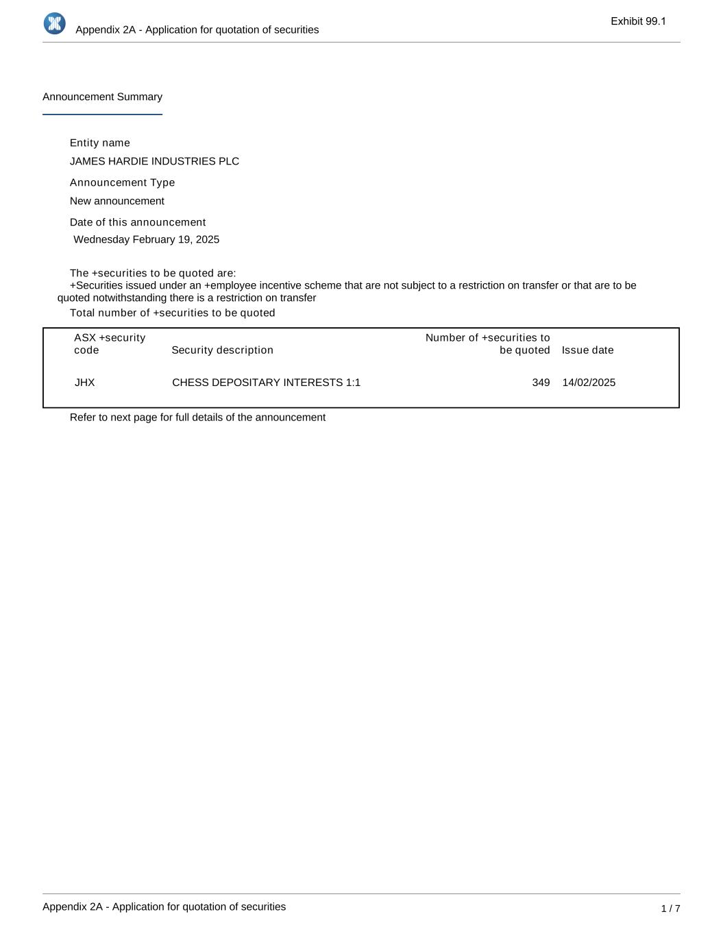 Appendix 2A - Application for quotation of securities Appendix 2A - Application for quotation of securities 1 / 7 Announcement Summary Entity name JAMES HARDIE INDUSTRIES PLC Announcement Type New announcement Date of this announcement Wednesday February 19, 2025 The +securities to be quoted are: Total number of +securities to be quoted ASX +security code Security description Number of +securities to be quoted Issue date JHX CHESS DEPOSITARY INTERESTS 1:1 349 14/02/2025 Refer to next page for full details of the announcement +Securities issued under an +employee incentive scheme that are not subject to a restriction on transfer or that are to be quoted notwithstanding there is a restriction on transfer Exhibit 99.1