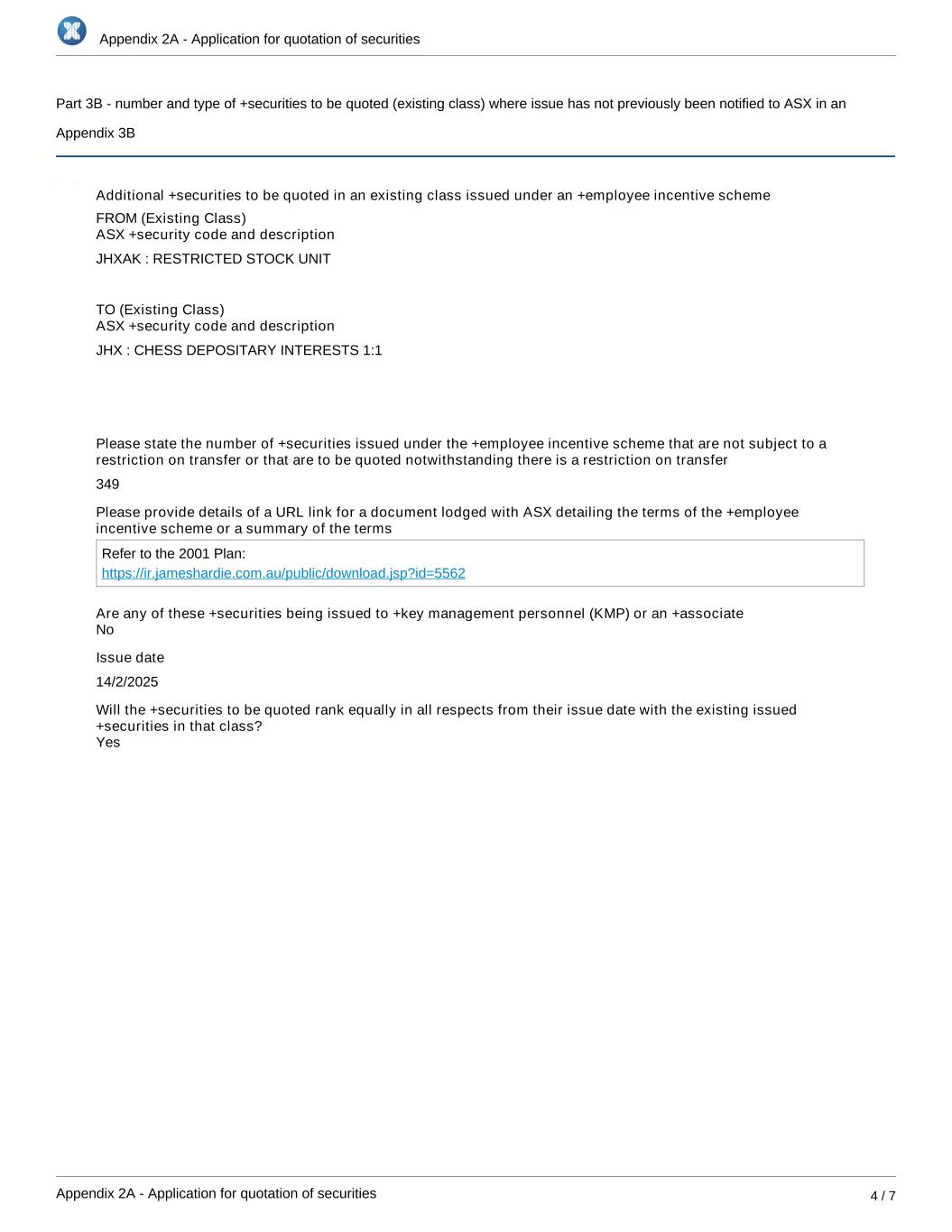 Appendix 2A - Application for quotation of securities Appendix 2A - Application for quotation of securities 4 / 7 Part 3B - number and type of +securities to be quoted (existing class) where issue has not previously been notified to ASX in an Appendix 3B Additional +securities to be quoted in an existing class issued under an +employee incentive scheme FROM (Existing Class) ASX +security code and description JHXAK : RESTRICTED STOCK UNIT TO (Existing Class) ASX +security code and description JHX : CHESS DEPOSITARY INTERESTS 1:1 Please state the number of +securities issued under the +employee incentive scheme that are not subject to a restriction on transfer or that are to be quoted notwithstanding there is a restriction on transfer 349 Please provide details of a URL link for a document lodged with ASX detailing the terms of the +employee incentive scheme or a summary of the terms Refer to the 2001 Plan: https://ir.jameshardie.com.au/public/download.jsp?id=5562 Are any of these +securities being issued to +key management personnel (KMP) or an +associate Issue date 14/2/2025 Will the +securities to be quoted rank equally in all respects from their issue date with the existing issued +securities in that class? Yes No