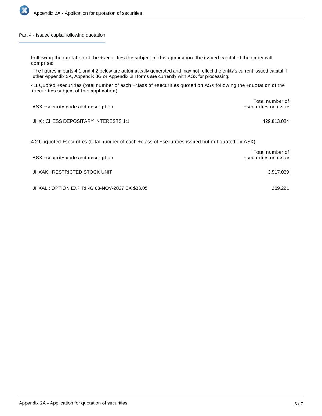 Appendix 2A - Application for quotation of securities Appendix 2A - Application for quotation of securities 6 / 7 Part 4 - Issued capital following quotation Following the quotation of the +securities the subject of this application, the issued capital of the entity will comprise: The figures in parts 4.1 and 4.2 below are automatically generated and may not reflect the entity's current issued capital if other Appendix 2A, Appendix 3G or Appendix 3H forms are currently with ASX for processing. 4.1 Quoted +securities (total number of each +class of +securities quoted on ASX following the +quotation of the +securities subject of this application) ASX +security code and description Total number of +securities on issue JHX : CHESS DEPOSITARY INTERESTS 1:1 429,813,084 4.2 Unquoted +securities (total number of each +class of +securities issued but not quoted on ASX) ASX +security code and description Total number of +securities on issue JHXAK : RESTRICTED STOCK UNIT 3,517,089 JHXAL : OPTION EXPIRING 03-NOV-2027 EX $33.05 269,221
