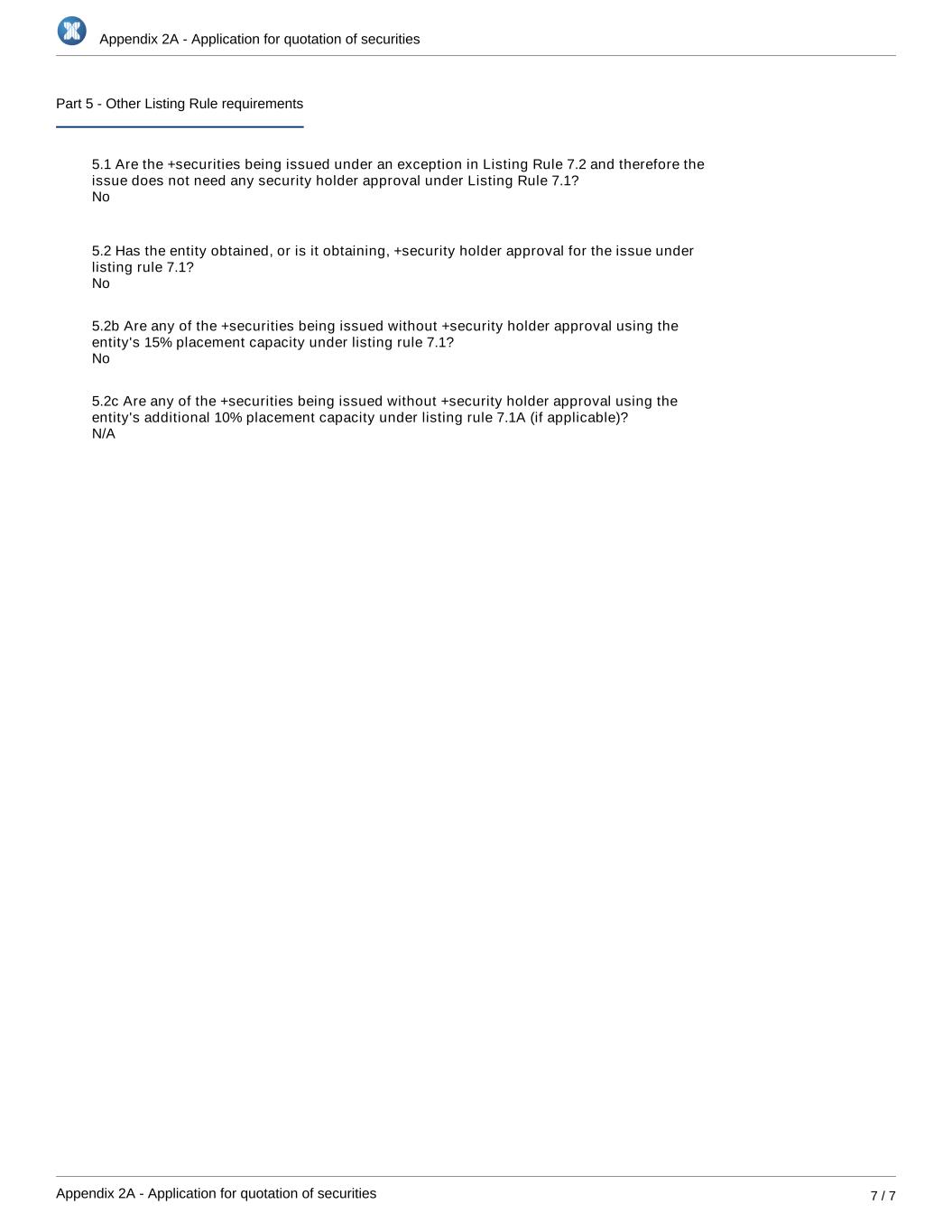 Appendix 2A - Application for quotation of securities Appendix 2A - Application for quotation of securities 7 / 7 Part 5 - Other Listing Rule requirements 5.1 Are the +securities being issued under an exception in Listing Rule 7.2 and therefore the issue does not need any security holder approval under Listing Rule 7.1? 5.2 Has the entity obtained, or is it obtaining, +security holder approval for the issue under listing rule 7.1? 5.2b Are any of the +securities being issued without +security holder approval using the entity's 15% placement capacity under listing rule 7.1? 5.2c Are any of the +securities being issued without +security holder approval using the entity's additional 10% placement capacity under listing rule 7.1A (if applicable)? N/A No No No