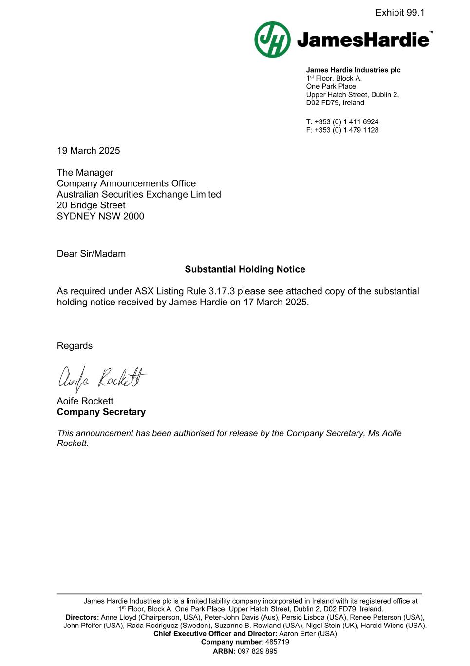 James Hardie Industries plc 1st Floor, Block A, One Park Place, Upper Hatch Street, Dublin 2, D02 FD79, Ireland T: +353 (0) 1 411 6924 F: +353 (0) 1 479 1128 James Hardie Industries plc is a limited liability company incorporated in Ireland with its registered office at 1st Floor, Block A, One Park Place, Upper Hatch Street, Dublin 2, D02 FD79, Ireland. Directors: Anne Lloyd (Chairperson, USA), Peter-John Davis (Aus), Persio Lisboa (USA), Renee Peterson (USA), John Pfeifer (USA), Rada Rodriguez (Sweden), Suzanne B. Rowland (USA), Nigel Stein (UK), Harold Wiens (USA). Chief Executive Officer and Director: Aaron Erter (USA) Company number: 485719 ARBN: 097 829 895 19 March 2025 The Manager Company Announcements Office Australian Securities Exchange Limited 20 Bridge Street SYDNEY NSW 2000 Dear Sir/Madam Substantial Holding Notice As required under ASX Listing Rule 3.17.3 please see attached copy of the substantial holding notice received by James Hardie on 17 March 2025. Regards Aoife Rockett Company Secretary This announcement has been authorised for release by the Company Secretary, Ms Aoife Rockett. Exhibit 99.1