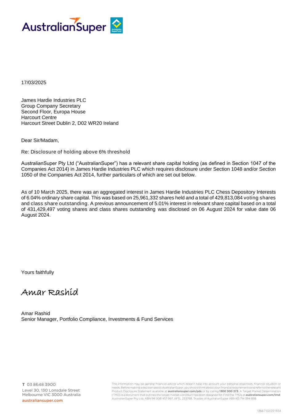 17/03/2025 James Hardie Industries PLC Group Company Secretary Second Floor, Europa House Harcourt Centre Harcourt Street Dublin 2, D02 WR20 Ireland Dear Sir/Madam, Re: Disclosure of holding above 6% threshold AustralianSuper Pty Ltd (“AustralianSuper”) has a relevant share capital holding (as defined in Section 1047 of the Companies Act 2014) in James Hardie Industries PLC which requires disclosure under Section 1048 and/or Section 1050 of the Companies Act 2014, further particulars of which are set out below. As of 10 March 2025, there was an aggregated interest in James Hardie Industries PLC Chess Depository Interests of 6.04% ordinary share capital. This was based on 25,961,332 shares held and a total of 429,813,084 voting shares and class share outstanding. A previous announcement of 5.01% interest in relevant share capital based on a total of 431,429,497 voting shares and class shares outstanding was disclosed on 06 August 2024 for value date 06 August 2024. Yours faithfully Amar Rashid Amar Rashid Senior Manager, Portfolio Compliance, Investments & Fund Services