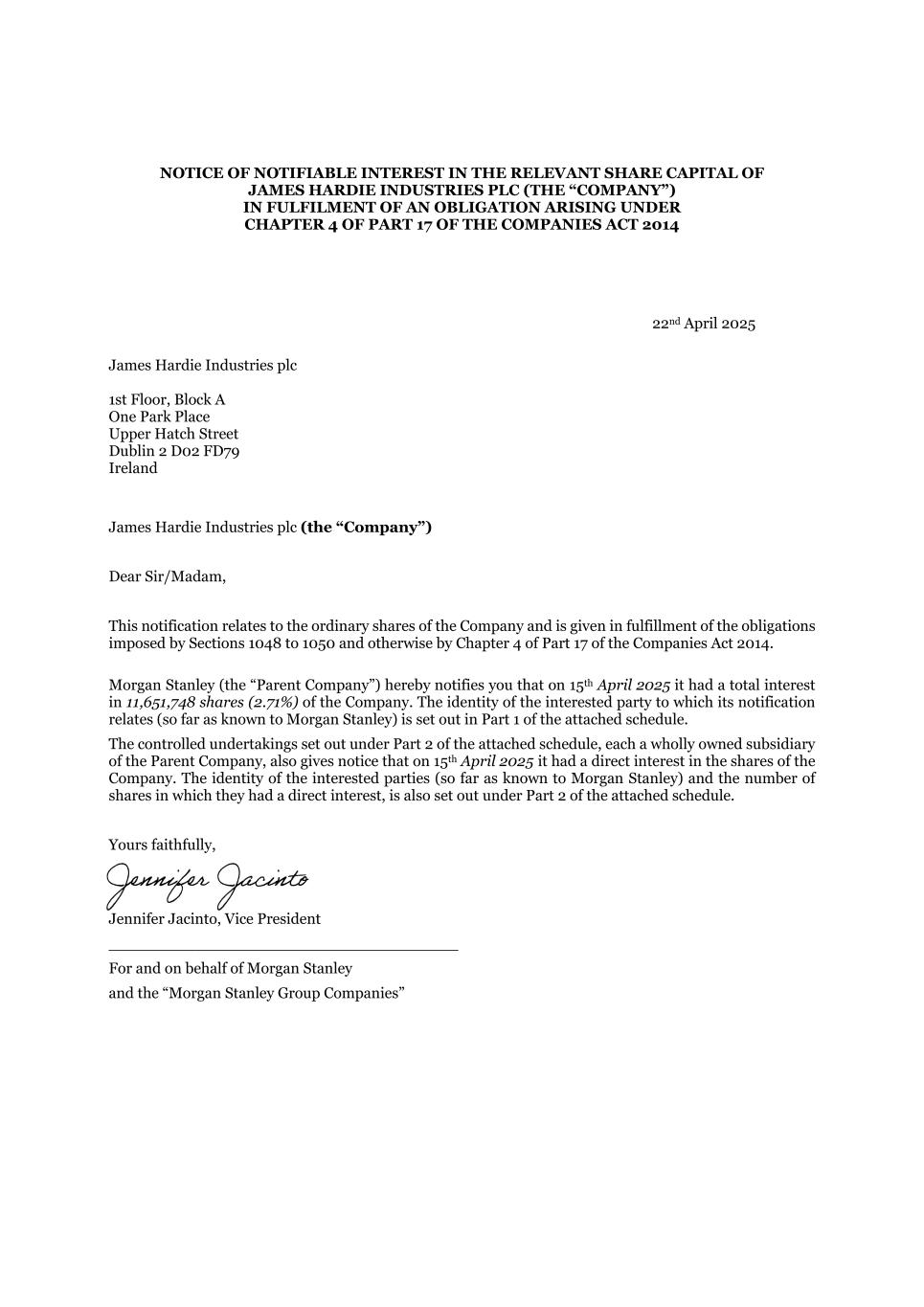 NOTICE OF NOTIFIABLE INTEREST IN THE RELEVANT SHARE CAPITAL OF JAMES HARDIE INDUSTRIES PLC (THE “COMPANY”) IN FULFILMENT OF AN OBLIGATION ARISING UNDER CHAPTER 4 OF PART 17 OF THE COMPANIES ACT 2014 22nd April 2025 James Hardie Industries plc 1st Floor, Block A One Park Place Upper Hatch Street Dublin 2 D02 FD79 Ireland James Hardie Industries plc (the “Company”) Dear Sir/Madam, This notification relates to the ordinary shares of the Company and is given in fulfillment of the obligations imposed by Sections 1048 to 1050 and otherwise by Chapter 4 of Part 17 of the Companies Act 2014. Morgan Stanley (the “Parent Company”) hereby notifies you that on 15th April 2025 it had a total interest in 11,651,748 shares (2.71%) of the Company. The identity of the interested party to which its notification relates (so far as known to Morgan Stanley) is set out in Part 1 of the attached schedule. The controlled undertakings set out under Part 2 of the attached schedule, each a wholly owned subsidiary of the Parent Company, also gives notice that on 15th April 2025 it had a direct interest in the shares of the Company. The identity of the interested parties (so far as known to Morgan Stanley) and the number of shares in which they had a direct interest, is also set out under Part 2 of the attached schedule. Yours faithfully, Jennifer Jacinto, Vice President ____________________________________ For and on behalf of Morgan Stanley and the “Morgan Stanley Group Companies”