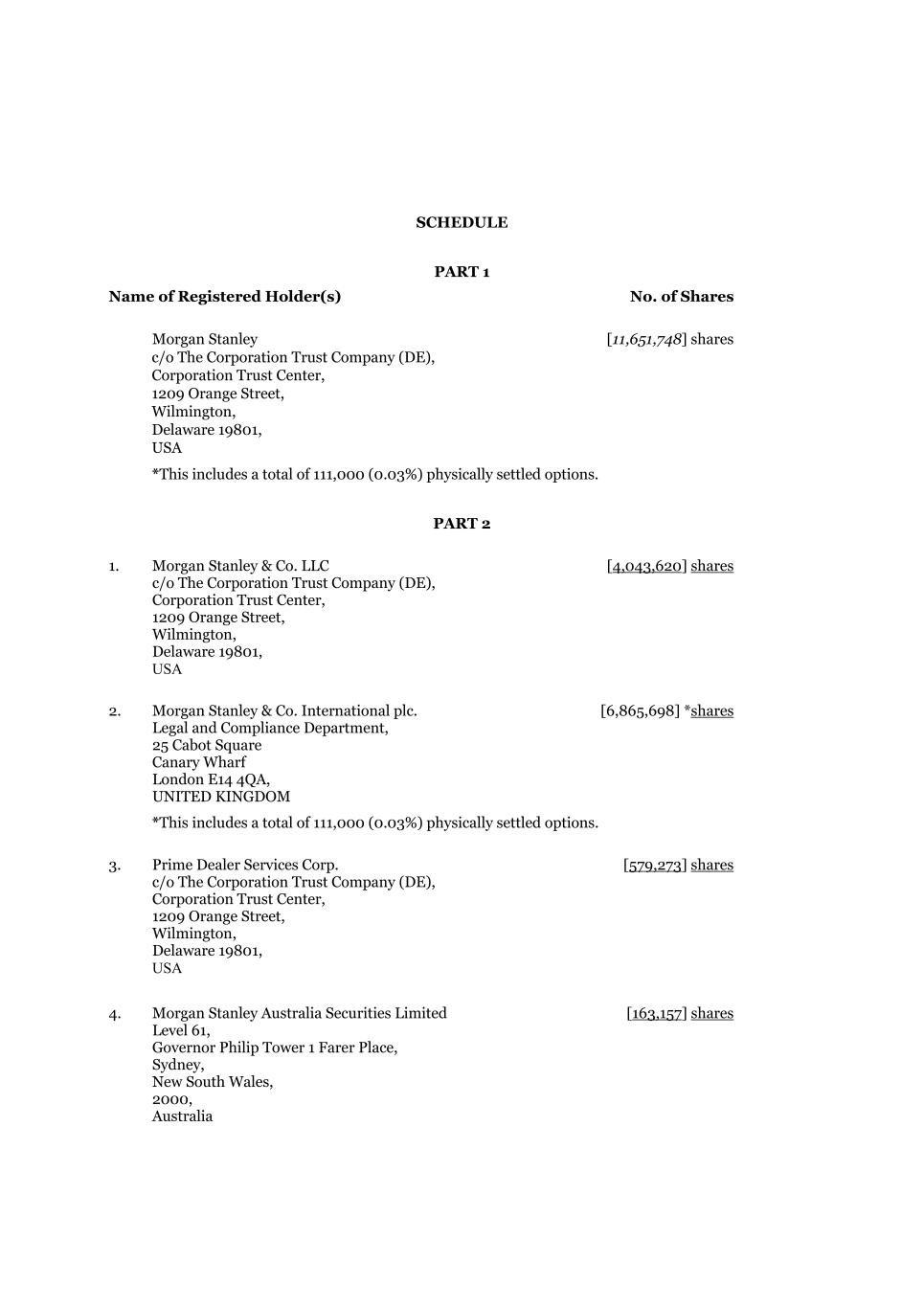 SCHEDULE PART 1 Name of Registered Holder(s) No. of Shares Morgan Stanley [11,651,748] shares c/o The Corporation Trust Company (DE), Corporation Trust Center, 1209 Orange Street, Wilmington, Delaware 19801, USA *This includes a total of 111,000 (0.03%) physically settled options. PART 2 1. Morgan Stanley & Co. LLC [4,043,620] shares c/o The Corporation Trust Company (DE), Corporation Trust Center, 1209 Orange Street, Wilmington, Delaware 19801, USA 2. Morgan Stanley & Co. International plc. [6,865,698] *shares Legal and Compliance Department, 25 Cabot Square Canary Wharf London E14 4QA, UNITED KINGDOM *This includes a total of 111,000 (0.03%) physically settled options. 3. Prime Dealer Services Corp. [579,273] shares c/o The Corporation Trust Company (DE), Corporation Trust Center, 1209 Orange Street, Wilmington, Delaware 19801, USA 4. Morgan Stanley Australia Securities Limited [163,157] shares Level 61, Governor Philip Tower 1 Farer Place, Sydney, New South Wales, 2000, Australia