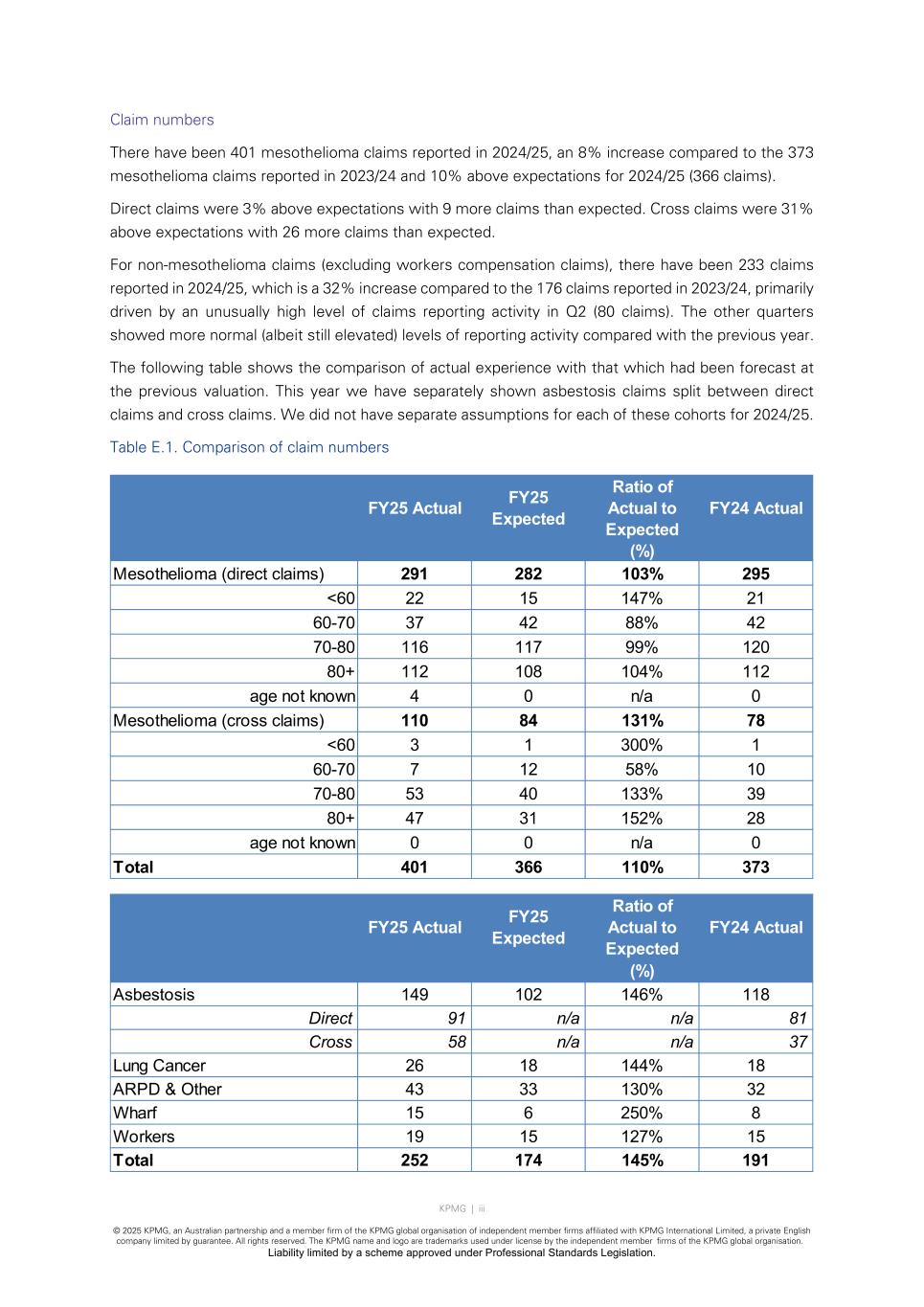KPMG | iii © 2025 KPMG, an Australian partnership and a member firm of the KPMG global organisation of independent member firms affiliated with KPMG International Limited, a private English company limited by guarantee. All rights reserved. The KPMG name and logo are trademarks used under license by the independent member firms of the KPMG global organisation. Liability limited by a scheme approved under Professional Standards Legislation. Claim numbers There have been 401 mesothelioma claims reported in 2024/25, an 8% increase compared to the 373 mesothelioma claims reported in 2023/24 and 10% above expectations for 2024/25 (366 claims). Direct claims were 3% above expectations with 9 more claims than expected. Cross claims were 31% above expectations with 26 more claims than expected. For non-mesothelioma claims (excluding workers compensation claims), there have been 233 claims reported in 2024/25, which is a 32% increase compared to the 176 claims reported in 2023/24, primarily driven by an unusually high level of claims reporting activity in Q2 (80 claims). The other quarters showed more normal (albeit still elevated) levels of reporting activity compared with the previous year. The following table shows the comparison of actual experience with that which had been forecast at the previous valuation. This year we have separately shown asbestosis claims split between direct claims and cross claims. We did not have separate assumptions for each of these cohorts for 2024/25. Table E.1. Comparison of claim numbers FY25 Actual FY25 Expected Ratio of Actual to Expected FY24 Actual (%) Mesothelioma (direct claims) 291 282 103% 295 <60 22 15 147% 21 60-70 37 42 88% 42 70-80 116 117 99% 120 80+ 112 108 104% 112 age not known 4 0 n/a 0 Mesothelioma (cross claims) 110 84 131% 78 <60 3 1 300% 1 60-70 7 12 58% 10 70-80 53 40 133% 39 80+ 47 31 152% 28 age not known 0 0 n/a 0 Total 401 366 110% 373 FY25 Actual FY25 Expected Ratio of Actual to Expected FY24 Actual (%) Asbestosis 149 102 146% 118 Direct 91 n/a n/a 81 Cross 58 n/a n/a 37 Lung Cancer 26 18 144% 18 ARPD & Other 43 33 130% 32 Wharf 15 6 250% 8 Workers 19 15 127% 15 Total 252 174 145% 191