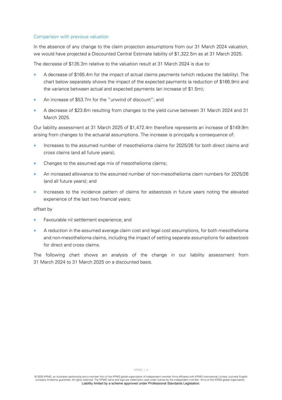 KPMG | vi © 2025 KPMG, an Australian partnership and a member firm of the KPMG global organisation of independent member firms affiliated with KPMG International Limited, a private English company limited by guarantee. All rights reserved. The KPMG name and logo are trademarks used under license by the independent member firms of the KPMG global organisation. Liability limited by a scheme approved under Professional Standards Legislation. Comparison with previous valuation In the absence of any change to the claim projection assumptions from our 31 March 2024 valuation, we would have projected a Discounted Central Estimate liability of $1,322.5m as at 31 March 2025. The decrease of $135.3m relative to the valuation result at 31 March 2024 is due to: • A decrease of $165.4m for the impact of actual claims payments (which reduces the liability). The chart below separately shows the impact of the expected payments (a reduction of $166.9m) and the variance between actual and expected payments (an increase of $1.5m); • An increase of $53.7m for the “unwind of discount”; and • A decrease of $23.6m resulting from changes to the yield curve between 31 March 2024 and 31 March 2025. Our liability assessment at 31 March 2025 of $1,472.4m therefore represents an increase of $149.9m arising from changes to the actuarial assumptions. The increase is principally a consequence of: • Increases to the assumed number of mesothelioma claims for 2025/26 for both direct claims and cross claims (and all future years); • Changes to the assumed age mix of mesothelioma claims; • An increased allowance to the assumed number of non-mesothelioma claim numbers for 2025/26 (and all future years); and • Increases to the incidence pattern of claims for asbestosis in future years noting the elevated experience of the last two financial years; offset by • Favourable nil settlement experience; and • A reduction in the assumed average claim cost and legal cost assumptions, for both mesothelioma and non-mesothelioma claims, including the impact of setting separate assumptions for asbestosis for direct and cross claims. The following chart shows an analysis of the change in our liability assessment from 31 March 2024 to 31 March 2025 on a discounted basis.
