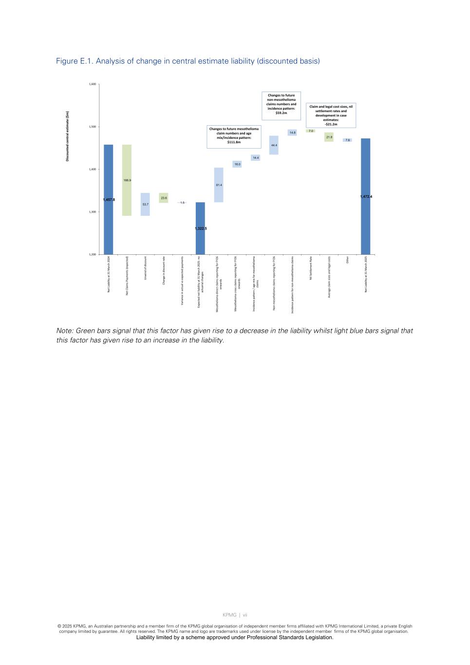 KPMG | vii © 2025 KPMG, an Australian partnership and a member firm of the KPMG global organisation of independent member firms affiliated with KPMG International Limited, a private English company limited by guarantee. All rights reserved. The KPMG name and logo are trademarks used under license by the independent member firms of the KPMG global organisation. Liability limited by a scheme approved under Professional Standards Legislation. Figure E.1. Analysis of change in central estimate liability (discounted basis) Note: Green bars signal that this factor has given rise to a decrease in the liability whilst light blue bars signal that this factor has given rise to an increase in the liability. 1,457.8 1,322.5 1,472.4 166.9 53.7 23.6 1.5 81.4 16.0 14.4 44.4 14.8 7.0 21.8 7.6 1,200 1,300 1,400 1,500 1,600 N et L ia bi lit y at 3 1 M ar ch 2 02 4 N et C la im s P ay m en ts (e xp ec te d) U nw in d of d isc ou nt Ch an ge in d isc ou nt ra te Va ria nc e in a ct ua l v s e xp ec te d pa ym en ts Ex pe ct ed n et li ab ili ty a t 3 1 M ar ch 2 02 5: n o ac tu ar ia l c ha ng es M es ot he lio m a di re ct c la im s r ep or tin g fo r F Y2 6 on w ar ds M es ot he lio m a cr os s c la im s r ep or tin g fo r F Y2 6 on w ar ds In ci de nc e pa tt er n / a ge m ix fo r m es ot he lio m a cl ai m s N on -m es ot he lio m a cl ai m s r ep or tin g fo r F Y2 6 In ci de nc e pa tt er n fo r n on -m es ot he lio m a cl ai m s N il Se tt le m en t R at e Av er ag e cl ai m si ze s a nd le ga l c os ts O th er N et L ia bi lit y at 3 1 M ar ch 2 02 5 Di sc ou nt ed c en tr al e st im at e ($ m ) Changes to future mesothelioma claim numbers and age mix/incidence pattern: $111.8m Changes to future non-mesothelioma claims numbers and incidence pattern: $59.2m Claim and legal cost sizes, nil settlement rates and development in case estimates: -$21.2m