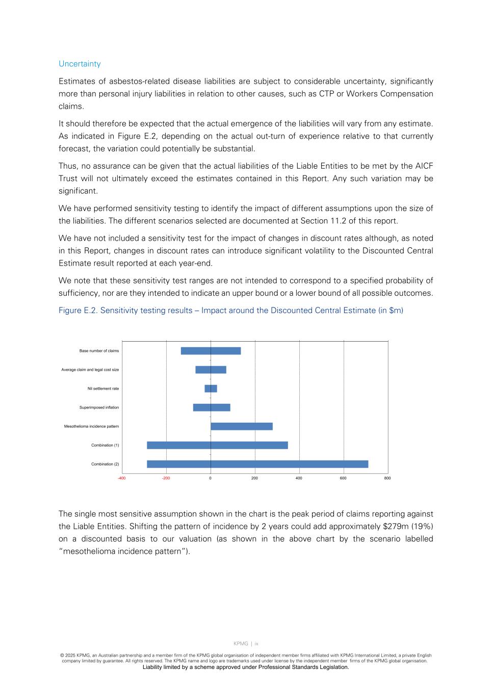 KPMG | ix © 2025 KPMG, an Australian partnership and a member firm of the KPMG global organisation of independent member firms affiliated with KPMG International Limited, a private English company limited by guarantee. All rights reserved. The KPMG name and logo are trademarks used under license by the independent member firms of the KPMG global organisation. Liability limited by a scheme approved under Professional Standards Legislation. Uncertainty Estimates of asbestos-related disease liabilities are subject to considerable uncertainty, significantly more than personal injury liabilities in relation to other causes, such as CTP or Workers Compensation claims. It should therefore be expected that the actual emergence of the liabilities will vary from any estimate. As indicated in Figure E.2, depending on the actual out-turn of experience relative to that currently forecast, the variation could potentially be substantial. Thus, no assurance can be given that the actual liabilities of the Liable Entities to be met by the AICF Trust will not ultimately exceed the estimates contained in this Report. Any such variation may be significant. We have performed sensitivity testing to identify the impact of different assumptions upon the size of the liabilities. The different scenarios selected are documented at Section 11.2 of this report. We have not included a sensitivity test for the impact of changes in discount rates although, as noted in this Report, changes in discount rates can introduce significant volatility to the Discounted Central Estimate result reported at each year-end. We note that these sensitivity test ranges are not intended to correspond to a specified probability of sufficiency, nor are they intended to indicate an upper bound or a lower bound of all possible outcomes. Figure E.2. Sensitivity testing results – Impact around the Discounted Central Estimate (in $m) The single most sensitive assumption shown in the chart is the peak period of claims reporting against the Liable Entities. Shifting the pattern of incidence by 2 years could add approximately $279m (19%) on a discounted basis to our valuation (as shown in the above chart by the scenario labelled “mesothelioma incidence pattern”). -400 -200 0 200 400 600 800 Base number of claims Average claim and legal cost size Nil settlement rate Superimposed inflation Mesothelioma incidence pattern Combination (1) Combination (2)