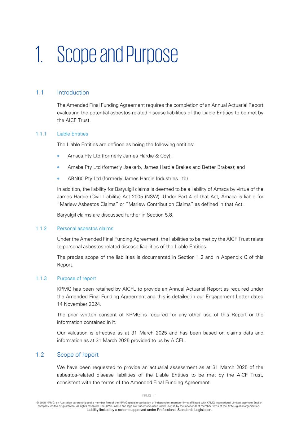 KPMG | 1 © 2025 KPMG, an Australian partnership and a member firm of the KPMG global organisation of independent member firms affiliated with KPMG International Limited, a private English company limited by guarantee. All rights reserved. The KPMG name and logo are trademarks used under license by the independent member firms of the KPMG global organisation. Liability limited by a scheme approved under Professional Standards Legislation. 1. Scope and Purpose 1.1 Introduction The Amended Final Funding Agreement requires the completion of an Annual Actuarial Report evaluating the potential asbestos-related disease liabilities of the Liable Entities to be met by the AICF Trust. 1.1.1 Liable Entities The Liable Entities are defined as being the following entities: • Amaca Pty Ltd (formerly James Hardie & Coy); • Amaba Pty Ltd (formerly Jsekarb, James Hardie Brakes and Better Brakes); and • ABN60 Pty Ltd (formerly James Hardie Industries Ltd). In addition, the liability for Baryulgil claims is deemed to be a liability of Amaca by virtue of the James Hardie (Civil Liability) Act 2005 (NSW). Under Part 4 of that Act, Amaca is liable for “Marlew Asbestos Claims” or “Marlew Contribution Claims” as defined in that Act. Baryulgil claims are discussed further in Section 5.8. 1.1.2 Personal asbestos claims Under the Amended Final Funding Agreement, the liabilities to be met by the AICF Trust relate to personal asbestos-related disease liabilities of the Liable Entities. The precise scope of the liabilities is documented in Section 1.2 and in Appendix C of this Report. 1.1.3 Purpose of report KPMG has been retained by AICFL to provide an Annual Actuarial Report as required under the Amended Final Funding Agreement and this is detailed in our Engagement Letter dated 14 November 2024. The prior written consent of KPMG is required for any other use of this Report or the information contained in it. Our valuation is effective as at 31 March 2025 and has been based on claims data and information as at 31 March 2025 provided to us by AICFL. 1.2 Scope of report We have been requested to provide an actuarial assessment as at 31 March 2025 of the asbestos-related disease liabilities of the Liable Entities to be met by the AICF Trust, consistent with the terms of the Amended Final Funding Agreement.