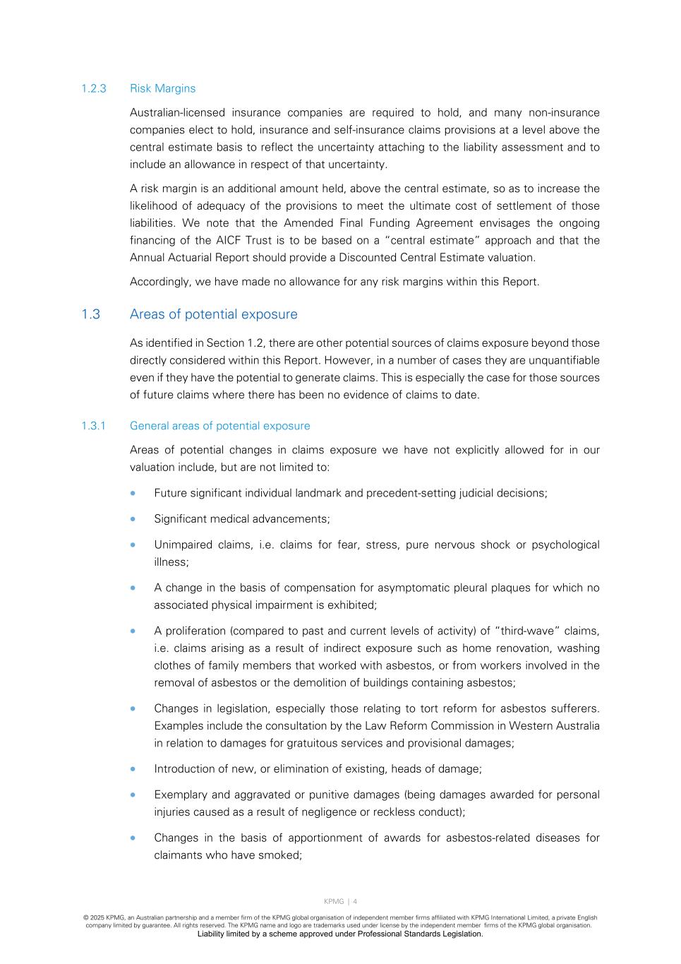 KPMG | 4 © 2025 KPMG, an Australian partnership and a member firm of the KPMG global organisation of independent member firms affiliated with KPMG International Limited, a private English company limited by guarantee. All rights reserved. The KPMG name and logo are trademarks used under license by the independent member firms of the KPMG global organisation. Liability limited by a scheme approved under Professional Standards Legislation. 1.2.3 Risk Margins Australian-licensed insurance companies are required to hold, and many non-insurance companies elect to hold, insurance and self-insurance claims provisions at a level above the central estimate basis to reflect the uncertainty attaching to the liability assessment and to include an allowance in respect of that uncertainty. A risk margin is an additional amount held, above the central estimate, so as to increase the likelihood of adequacy of the provisions to meet the ultimate cost of settlement of those liabilities. We note that the Amended Final Funding Agreement envisages the ongoing financing of the AICF Trust is to be based on a “central estimate” approach and that the Annual Actuarial Report should provide a Discounted Central Estimate valuation. Accordingly, we have made no allowance for any risk margins within this Report. 1.3 Areas of potential exposure As identified in Section 1.2, there are other potential sources of claims exposure beyond those directly considered within this Report. However, in a number of cases they are unquantifiable even if they have the potential to generate claims. This is especially the case for those sources of future claims where there has been no evidence of claims to date. 1.3.1 General areas of potential exposure Areas of potential changes in claims exposure we have not explicitly allowed for in our valuation include, but are not limited to: • Future significant individual landmark and precedent-setting judicial decisions; • Significant medical advancements; • Unimpaired claims, i.e. claims for fear, stress, pure nervous shock or psychological illness; • A change in the basis of compensation for asymptomatic pleural plaques for which no associated physical impairment is exhibited; • A proliferation (compared to past and current levels of activity) of “third-wave” claims, i.e. claims arising as a result of indirect exposure such as home renovation, washing clothes of family members that worked with asbestos, or from workers involved in the removal of asbestos or the demolition of buildings containing asbestos; • Changes in legislation, especially those relating to tort reform for asbestos sufferers. Examples include the consultation by the Law Reform Commission in Western Australia in relation to damages for gratuitous services and provisional damages; • Introduction of new, or elimination of existing, heads of damage; • Exemplary and aggravated or punitive damages (being damages awarded for personal injuries caused as a result of negligence or reckless conduct); • Changes in the basis of apportionment of awards for asbestos-related diseases for claimants who have smoked;