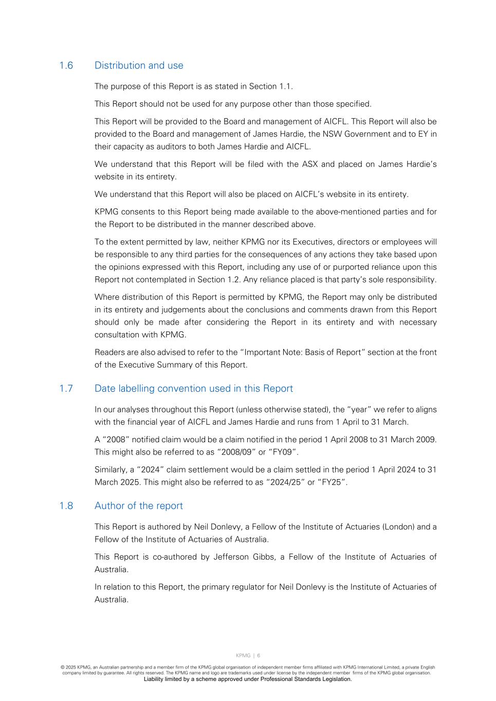 KPMG | 6 © 2025 KPMG, an Australian partnership and a member firm of the KPMG global organisation of independent member firms affiliated with KPMG International Limited, a private English company limited by guarantee. All rights reserved. The KPMG name and logo are trademarks used under license by the independent member firms of the KPMG global organisation. Liability limited by a scheme approved under Professional Standards Legislation. 1.6 Distribution and use The purpose of this Report is as stated in Section 1.1. This Report should not be used for any purpose other than those specified. This Report will be provided to the Board and management of AICFL. This Report will also be provided to the Board and management of James Hardie, the NSW Government and to EY in their capacity as auditors to both James Hardie and AICFL. We understand that this Report will be filed with the ASX and placed on James Hardie’s website in its entirety. We understand that this Report will also be placed on AICFL’s website in its entirety. KPMG consents to this Report being made available to the above-mentioned parties and for the Report to be distributed in the manner described above. To the extent permitted by law, neither KPMG nor its Executives, directors or employees will be responsible to any third parties for the consequences of any actions they take based upon the opinions expressed with this Report, including any use of or purported reliance upon this Report not contemplated in Section 1.2. Any reliance placed is that party’s sole responsibility. Where distribution of this Report is permitted by KPMG, the Report may only be distributed in its entirety and judgements about the conclusions and comments drawn from this Report should only be made after considering the Report in its entirety and with necessary consultation with KPMG. Readers are also advised to refer to the “Important Note: Basis of Report” section at the front of the Executive Summary of this Report. 1.7 Date labelling convention used in this Report In our analyses throughout this Report (unless otherwise stated), the “year” we refer to aligns with the financial year of AICFL and James Hardie and runs from 1 April to 31 March. A “2008” notified claim would be a claim notified in the period 1 April 2008 to 31 March 2009. This might also be referred to as “2008/09” or “FY09”. Similarly, a “2024” claim settlement would be a claim settled in the period 1 April 2024 to 31 March 2025. This might also be referred to as “2024/25” or “FY25”. 1.8 Author of the report This Report is authored by Neil Donlevy, a Fellow of the Institute of Actuaries (London) and a Fellow of the Institute of Actuaries of Australia. This Report is co-authored by Jefferson Gibbs, a Fellow of the Institute of Actuaries of Australia. In relation to this Report, the primary regulator for Neil Donlevy is the Institute of Actuaries of Australia.