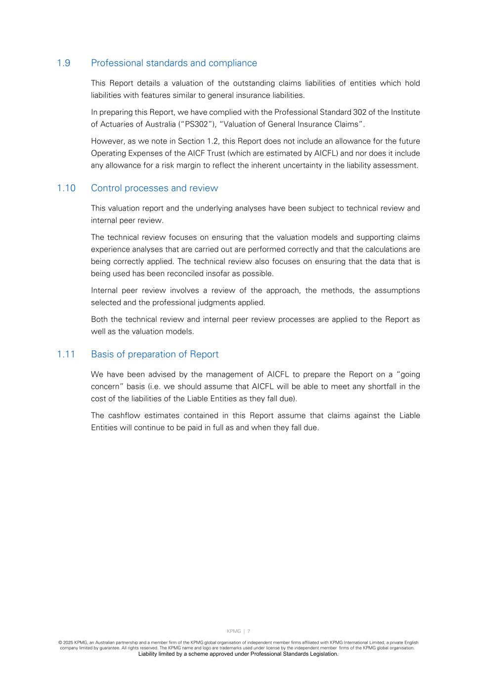 KPMG | 7 © 2025 KPMG, an Australian partnership and a member firm of the KPMG global organisation of independent member firms affiliated with KPMG International Limited, a private English company limited by guarantee. All rights reserved. The KPMG name and logo are trademarks used under license by the independent member firms of the KPMG global organisation. Liability limited by a scheme approved under Professional Standards Legislation. 1.9 Professional standards and compliance This Report details a valuation of the outstanding claims liabilities of entities which hold liabilities with features similar to general insurance liabilities. In preparing this Report, we have complied with the Professional Standard 302 of the Institute of Actuaries of Australia (“PS302”), “Valuation of General Insurance Claims”. However, as we note in Section 1.2, this Report does not include an allowance for the future Operating Expenses of the AICF Trust (which are estimated by AICFL) and nor does it include any allowance for a risk margin to reflect the inherent uncertainty in the liability assessment. 1.10 Control processes and review This valuation report and the underlying analyses have been subject to technical review and internal peer review. The technical review focuses on ensuring that the valuation models and supporting claims experience analyses that are carried out are performed correctly and that the calculations are being correctly applied. The technical review also focuses on ensuring that the data that is being used has been reconciled insofar as possible. Internal peer review involves a review of the approach, the methods, the assumptions selected and the professional judgments applied. Both the technical review and internal peer review processes are applied to the Report as well as the valuation models. 1.11 Basis of preparation of Report We have been advised by the management of AICFL to prepare the Report on a “going concern” basis (i.e. we should assume that AICFL will be able to meet any shortfall in the cost of the liabilities of the Liable Entities as they fall due). The cashflow estimates contained in this Report assume that claims against the Liable Entities will continue to be paid in full as and when they fall due.