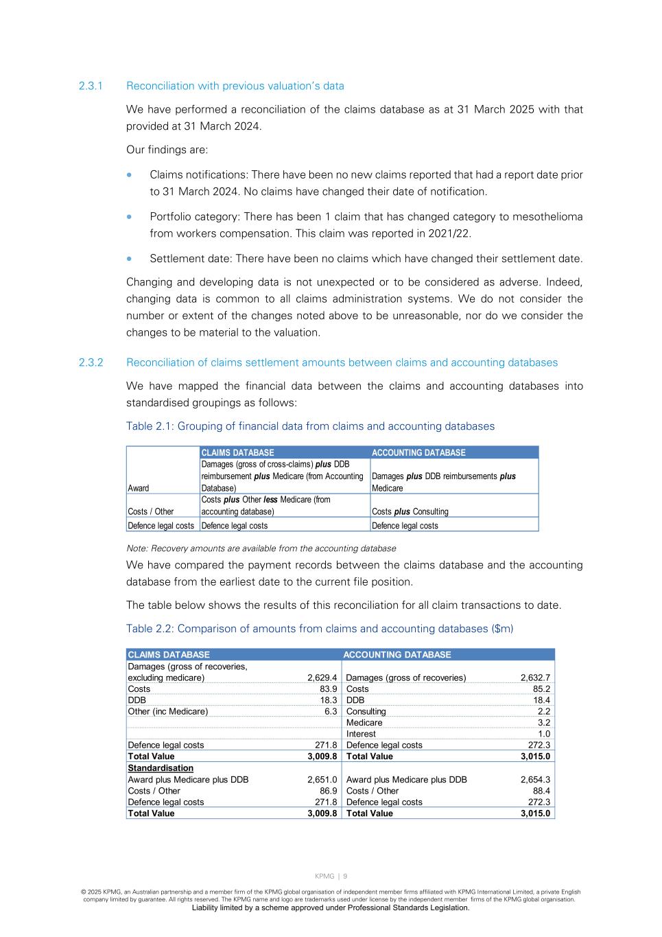 KPMG | 9 © 2025 KPMG, an Australian partnership and a member firm of the KPMG global organisation of independent member firms affiliated with KPMG International Limited, a private English company limited by guarantee. All rights reserved. The KPMG name and logo are trademarks used under license by the independent member firms of the KPMG global organisation. Liability limited by a scheme approved under Professional Standards Legislation. 2.3.1 Reconciliation with previous valuation’s data We have performed a reconciliation of the claims database as at 31 March 2025 with that provided at 31 March 2024. Our findings are: • Claims notifications: There have been no new claims reported that had a report date prior to 31 March 2024. No claims have changed their date of notification. • Portfolio category: There has been 1 claim that has changed category to mesothelioma from workers compensation. This claim was reported in 2021/22. • Settlement date: There have been no claims which have changed their settlement date. Changing and developing data is not unexpected or to be considered as adverse. Indeed, changing data is common to all claims administration systems. We do not consider the number or extent of the changes noted above to be unreasonable, nor do we consider the changes to be material to the valuation. 2.3.2 Reconciliation of claims settlement amounts between claims and accounting databases We have mapped the financial data between the claims and accounting databases into standardised groupings as follows: Table 2.1: Grouping of financial data from claims and accounting databases Note: Recovery amounts are available from the accounting database We have compared the payment records between the claims database and the accounting database from the earliest date to the current file position. The table below shows the results of this reconciliation for all claim transactions to date. Table 2.2: Comparison of amounts from claims and accounting databases ($m) CLAIMS DATABASE ACCOUNTING DATABASE Award Costs / Other Defence legal costs Defence legal costs Defence legal costs Damages (gross of cross-claims) plus DDB reimbursement plus Medicare (from Accounting Database) Damages plus DDB reimbursements plus Medicare Costs plus Other less Medicare (from accounting database) Costs plus Consulting CLAIMS DATABASE ACCOUNTING DATABASE Damages (gross of recoveries, excluding medicare) 2,629.4 Damages (gross of recoveries) 2,632.7 Costs 83.9 Costs 85.2 DDB 18.3 DDB 18.4 Other (inc Medicare) 6.3 Consulting 2.2 Medicare 3.2 Interest 1.0 Defence legal costs 271.8 Defence legal costs 272.3 Total Value 3,009.8 Total Value 3,015.0 Standardisation Award plus Medicare plus DDB 2,651.0 Award plus Medicare plus DDB 2,654.3 Costs / Other 86.9 Costs / Other 88.4 Defence legal costs 271.8 Defence legal costs 272.3 Total Value 3,009.8 Total Value 3,015.0