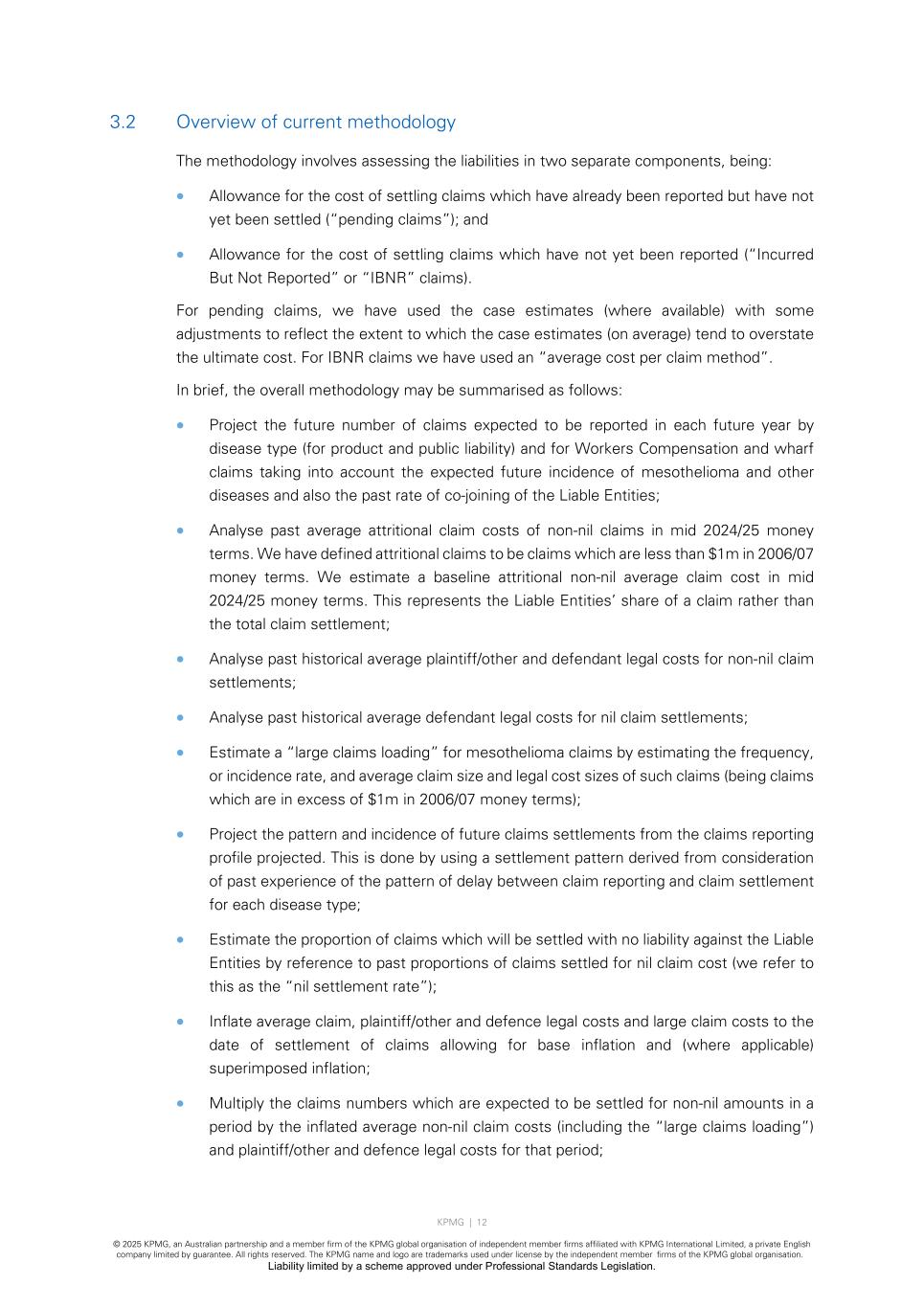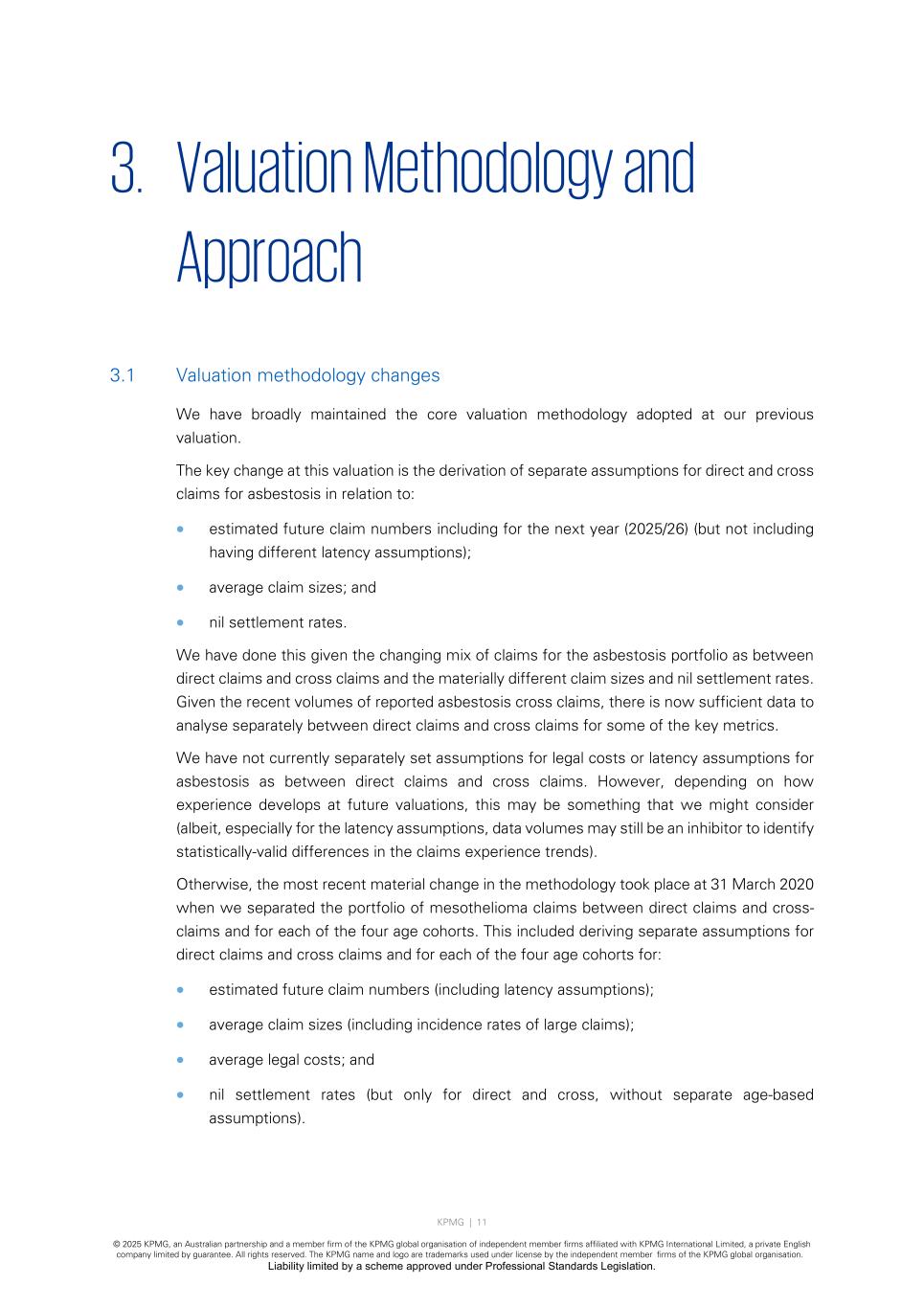 KPMG | 11 © 2025 KPMG, an Australian partnership and a member firm of the KPMG global organisation of independent member firms affiliated with KPMG International Limited, a private English company limited by guarantee. All rights reserved. The KPMG name and logo are trademarks used under license by the independent member firms of the KPMG global organisation. Liability limited by a scheme approved under Professional Standards Legislation. 3. Valuation Methodology and Approach 3.1 Valuation methodology changes We have broadly maintained the core valuation methodology adopted at our previous valuation. The key change at this valuation is the derivation of separate assumptions for direct and cross claims for asbestosis in relation to: • estimated future claim numbers including for the next year (2025/26) (but not including having different latency assumptions); • average claim sizes; and • nil settlement rates. We have done this given the changing mix of claims for the asbestosis portfolio as between direct claims and cross claims and the materially different claim sizes and nil settlement rates. Given the recent volumes of reported asbestosis cross claims, there is now sufficient data to analyse separately between direct claims and cross claims for some of the key metrics. We have not currently separately set assumptions for legal costs or latency assumptions for asbestosis as between direct claims and cross claims. However, depending on how experience develops at future valuations, this may be something that we might consider (albeit, especially for the latency assumptions, data volumes may still be an inhibitor to identify statistically-valid differences in the claims experience trends). Otherwise, the most recent material change in the methodology took place at 31 March 2020 when we separated the portfolio of mesothelioma claims between direct claims and cross- claims and for each of the four age cohorts. This included deriving separate assumptions for direct claims and cross claims and for each of the four age cohorts for: • estimated future claim numbers (including latency assumptions); • average claim sizes (including incidence rates of large claims); • average legal costs; and • nil settlement rates (but only for direct and cross, without separate age-based assumptions).