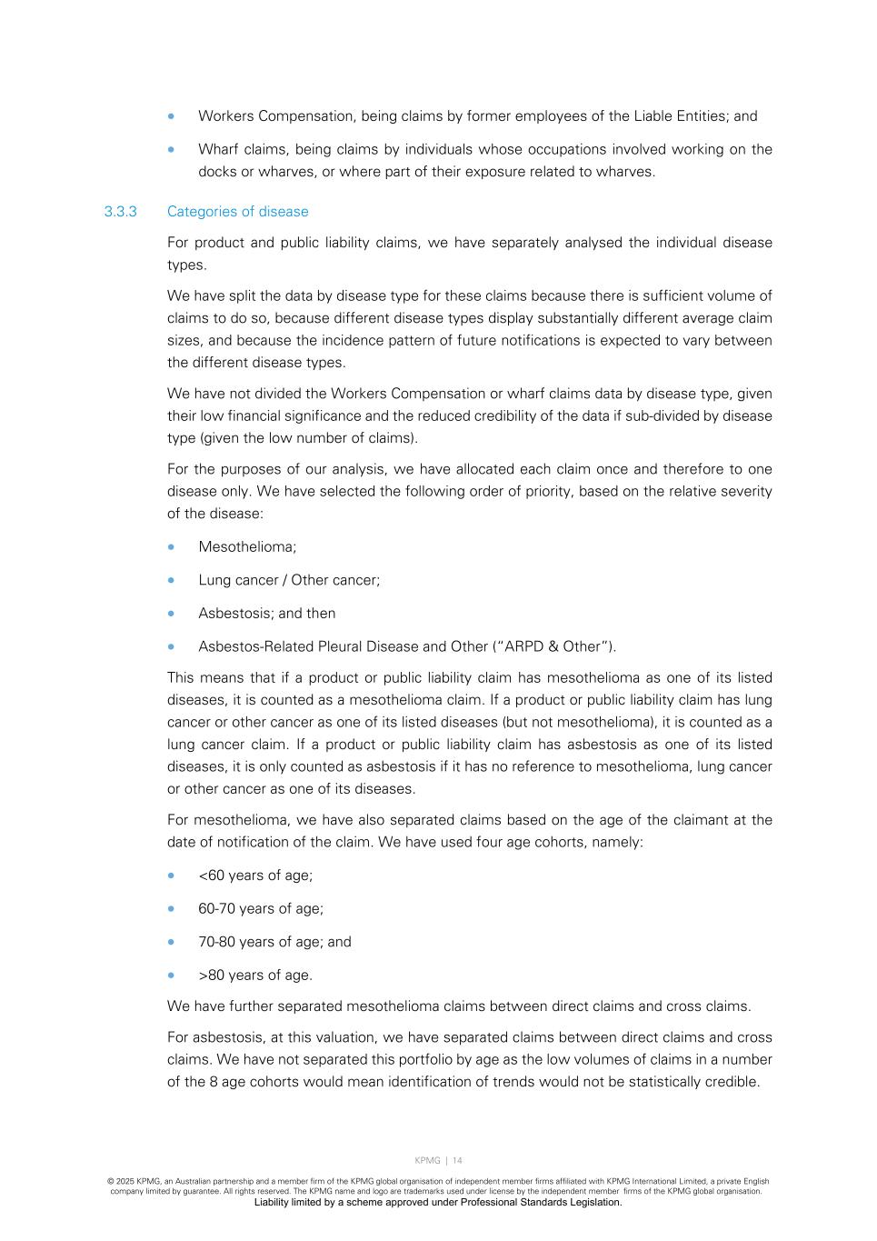 KPMG | 14 © 2025 KPMG, an Australian partnership and a member firm of the KPMG global organisation of independent member firms affiliated with KPMG International Limited, a private English company limited by guarantee. All rights reserved. The KPMG name and logo are trademarks used under license by the independent member firms of the KPMG global organisation. Liability limited by a scheme approved under Professional Standards Legislation. • Workers Compensation, being claims by former employees of the Liable Entities; and • Wharf claims, being claims by individuals whose occupations involved working on the docks or wharves, or where part of their exposure related to wharves. 3.3.3 Categories of disease For product and public liability claims, we have separately analysed the individual disease types. We have split the data by disease type for these claims because there is sufficient volume of claims to do so, because different disease types display substantially different average claim sizes, and because the incidence pattern of future notifications is expected to vary between the different disease types. We have not divided the Workers Compensation or wharf claims data by disease type, given their low financial significance and the reduced credibility of the data if sub-divided by disease type (given the low number of claims). For the purposes of our analysis, we have allocated each claim once and therefore to one disease only. We have selected the following order of priority, based on the relative severity of the disease: • Mesothelioma; • Lung cancer / Other cancer; • Asbestosis; and then • Asbestos-Related Pleural Disease and Other (“ARPD & Other”). This means that if a product or public liability claim has mesothelioma as one of its listed diseases, it is counted as a mesothelioma claim. If a product or public liability claim has lung cancer or other cancer as one of its listed diseases (but not mesothelioma), it is counted as a lung cancer claim. If a product or public liability claim has asbestosis as one of its listed diseases, it is only counted as asbestosis if it has no reference to mesothelioma, lung cancer or other cancer as one of its diseases. For mesothelioma, we have also separated claims based on the age of the claimant at the date of notification of the claim. We have used four age cohorts, namely: • <60 years of age; • 60-70 years of age; • 70-80 years of age; and • >80 years of age. We have further separated mesothelioma claims between direct claims and cross claims. For asbestosis, at this valuation, we have separated claims between direct claims and cross claims. We have not separated this portfolio by age as the low volumes of claims in a number of the 8 age cohorts would mean identification of trends would not be statistically credible.