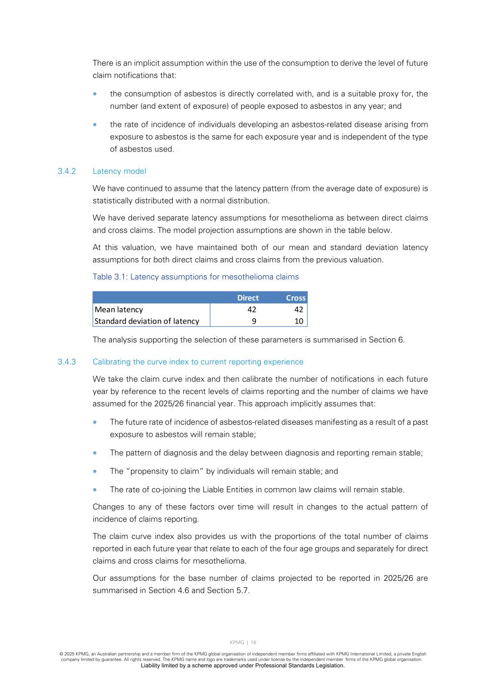 KPMG | 16 © 2025 KPMG, an Australian partnership and a member firm of the KPMG global organisation of independent member firms affiliated with KPMG International Limited, a private English company limited by guarantee. All rights reserved. The KPMG name and logo are trademarks used under license by the independent member firms of the KPMG global organisation. Liability limited by a scheme approved under Professional Standards Legislation. There is an implicit assumption within the use of the consumption to derive the level of future claim notifications that: • the consumption of asbestos is directly correlated with, and is a suitable proxy for, the number (and extent of exposure) of people exposed to asbestos in any year; and • the rate of incidence of individuals developing an asbestos-related disease arising from exposure to asbestos is the same for each exposure year and is independent of the type of asbestos used. 3.4.2 Latency model We have continued to assume that the latency pattern (from the average date of exposure) is statistically distributed with a normal distribution. We have derived separate latency assumptions for mesothelioma as between direct claims and cross claims. The model projection assumptions are shown in the table below. At this valuation, we have maintained both of our mean and standard deviation latency assumptions for both direct claims and cross claims from the previous valuation. Table 3.1: Latency assumptions for mesothelioma claims The analysis supporting the selection of these parameters is summarised in Section 6. 3.4.3 Calibrating the curve index to current reporting experience We take the claim curve index and then calibrate the number of notifications in each future year by reference to the recent levels of claims reporting and the number of claims we have assumed for the 2025/26 financial year. This approach implicitly assumes that: • The future rate of incidence of asbestos-related diseases manifesting as a result of a past exposure to asbestos will remain stable; • The pattern of diagnosis and the delay between diagnosis and reporting remain stable; • The “propensity to claim” by individuals will remain stable; and • The rate of co-joining the Liable Entities in common law claims will remain stable. Changes to any of these factors over time will result in changes to the actual pattern of incidence of claims reporting. The claim curve index also provides us with the proportions of the total number of claims reported in each future year that relate to each of the four age groups and separately for direct claims and cross claims for mesothelioma. Our assumptions for the base number of claims projected to be reported in 2025/26 are summarised in Section 4.6 and Section 5.7. Direct Cross Mean latency 42 42 Standard deviation of latency 9 10