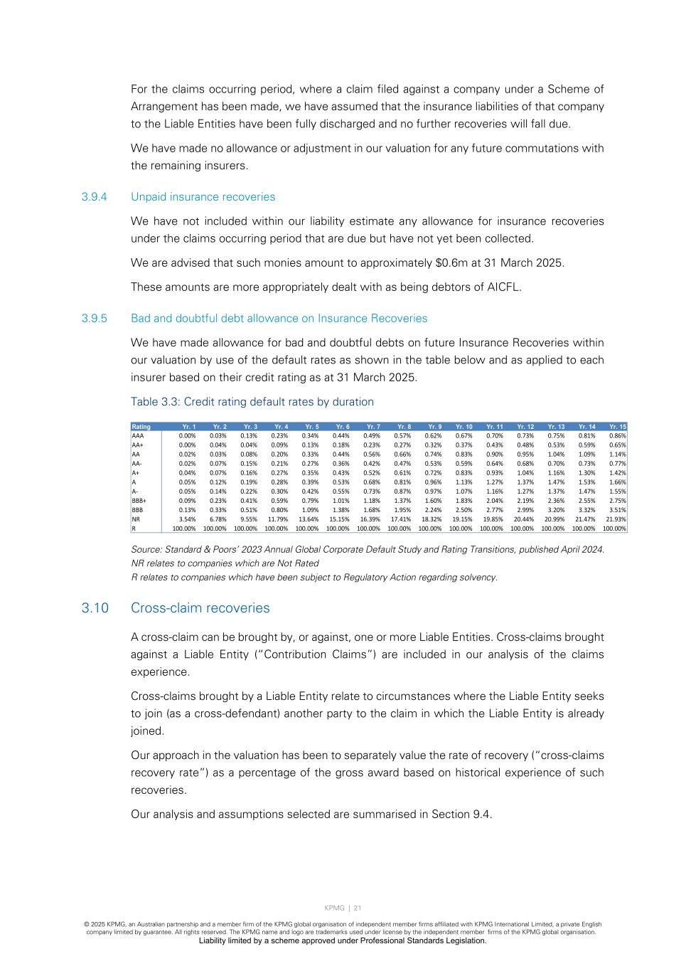 KPMG | 21 © 2025 KPMG, an Australian partnership and a member firm of the KPMG global organisation of independent member firms affiliated with KPMG International Limited, a private English company limited by guarantee. All rights reserved. The KPMG name and logo are trademarks used under license by the independent member firms of the KPMG global organisation. Liability limited by a scheme approved under Professional Standards Legislation. For the claims occurring period, where a claim filed against a company under a Scheme of Arrangement has been made, we have assumed that the insurance liabilities of that company to the Liable Entities have been fully discharged and no further recoveries will fall due. We have made no allowance or adjustment in our valuation for any future commutations with the remaining insurers. 3.9.4 Unpaid insurance recoveries We have not included within our liability estimate any allowance for insurance recoveries under the claims occurring period that are due but have not yet been collected. We are advised that such monies amount to approximately $0.6m at 31 March 2025. These amounts are more appropriately dealt with as being debtors of AICFL. 3.9.5 Bad and doubtful debt allowance on Insurance Recoveries We have made allowance for bad and doubtful debts on future Insurance Recoveries within our valuation by use of the default rates as shown in the table below and as applied to each insurer based on their credit rating as at 31 March 2025. Table 3.3: Credit rating default rates by duration Source: Standard & Poors’ 2023 Annual Global Corporate Default Study and Rating Transitions, published April 2024. NR relates to companies which are Not Rated R relates to companies which have been subject to Regulatory Action regarding solvency. 3.10 Cross-claim recoveries A cross-claim can be brought by, or against, one or more Liable Entities. Cross-claims brought against a Liable Entity (“Contribution Claims”) are included in our analysis of the claims experience. Cross-claims brought by a Liable Entity relate to circumstances where the Liable Entity seeks to join (as a cross-defendant) another party to the claim in which the Liable Entity is already joined. Our approach in the valuation has been to separately value the rate of recovery (“cross-claims recovery rate”) as a percentage of the gross award based on historical experience of such recoveries. Our analysis and assumptions selected are summarised in Section 9.4. Rating Yr. 1 Yr. 2 Yr. 3 Yr. 4 Yr. 5 Yr. 6 Yr. 7 Yr. 8 Yr. 9 Yr. 10 Yr. 11 Yr. 12 Yr. 13 Yr. 14 Yr. 15 AAA 0.00% 0.03% 0.13% 0.23% 0.34% 0.44% 0.49% 0.57% 0.62% 0.67% 0.70% 0.73% 0.75% 0.81% 0.86% AA+ 0.00% 0.04% 0.04% 0.09% 0.13% 0.18% 0.23% 0.27% 0.32% 0.37% 0.43% 0.48% 0.53% 0.59% 0.65% AA 0.02% 0.03% 0.08% 0.20% 0.33% 0.44% 0.56% 0.66% 0.74% 0.83% 0.90% 0.95% 1.04% 1.09% 1.14% AA- 0.02% 0.07% 0.15% 0.21% 0.27% 0.36% 0.42% 0.47% 0.53% 0.59% 0.64% 0.68% 0.70% 0.73% 0.77% A+ 0.04% 0.07% 0.16% 0.27% 0.35% 0.43% 0.52% 0.61% 0.72% 0.83% 0.93% 1.04% 1.16% 1.30% 1.42% A 0.05% 0.12% 0.19% 0.28% 0.39% 0.53% 0.68% 0.81% 0.96% 1.13% 1.27% 1.37% 1.47% 1.53% 1.66% A- 0.05% 0.14% 0.22% 0.30% 0.42% 0.55% 0.73% 0.87% 0.97% 1.07% 1.16% 1.27% 1.37% 1.47% 1.55% BBB+ 0.09% 0.23% 0.41% 0.59% 0.79% 1.01% 1.18% 1.37% 1.60% 1.83% 2.04% 2.19% 2.36% 2.55% 2.75% BBB 0.13% 0.33% 0.51% 0.80% 1.09% 1.38% 1.68% 1.95% 2.24% 2.50% 2.77% 2.99% 3.20% 3.32% 3.51% NR 3.54% 6.78% 9.55% 11.79% 13.64% 15.15% 16.39% 17.41% 18.32% 19.15% 19.85% 20.44% 20.99% 21.47% 21.93% R 100.00% 100.00% 100.00% 100.00% 100.00% 100.00% 100.00% 100.00% 100.00% 100.00% 100.00% 100.00% 100.00% 100.00% 100.00%