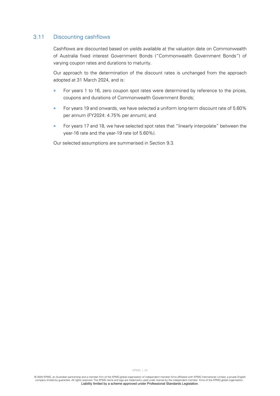 KPMG | 22 © 2025 KPMG, an Australian partnership and a member firm of the KPMG global organisation of independent member firms affiliated with KPMG International Limited, a private English company limited by guarantee. All rights reserved. The KPMG name and logo are trademarks used under license by the independent member firms of the KPMG global organisation. Liability limited by a scheme approved under Professional Standards Legislation. 3.11 Discounting cashflows Cashflows are discounted based on yields available at the valuation date on Commonwealth of Australia fixed interest Government Bonds (“Commonwealth Government Bonds”) of varying coupon rates and durations to maturity. Our approach to the determination of the discount rates is unchanged from the approach adopted at 31 March 2024, and is: • For years 1 to 16, zero coupon spot rates were determined by reference to the prices, coupons and durations of Commonwealth Government Bonds; • For years 19 and onwards, we have selected a uniform long-term discount rate of 5.60% per annum (FY2024: 4.75% per annum); and • For years 17 and 18, we have selected spot rates that “linearly interpolate” between the year-16 rate and the year-19 rate (of 5.60%). Our selected assumptions are summarised in Section 9.3.